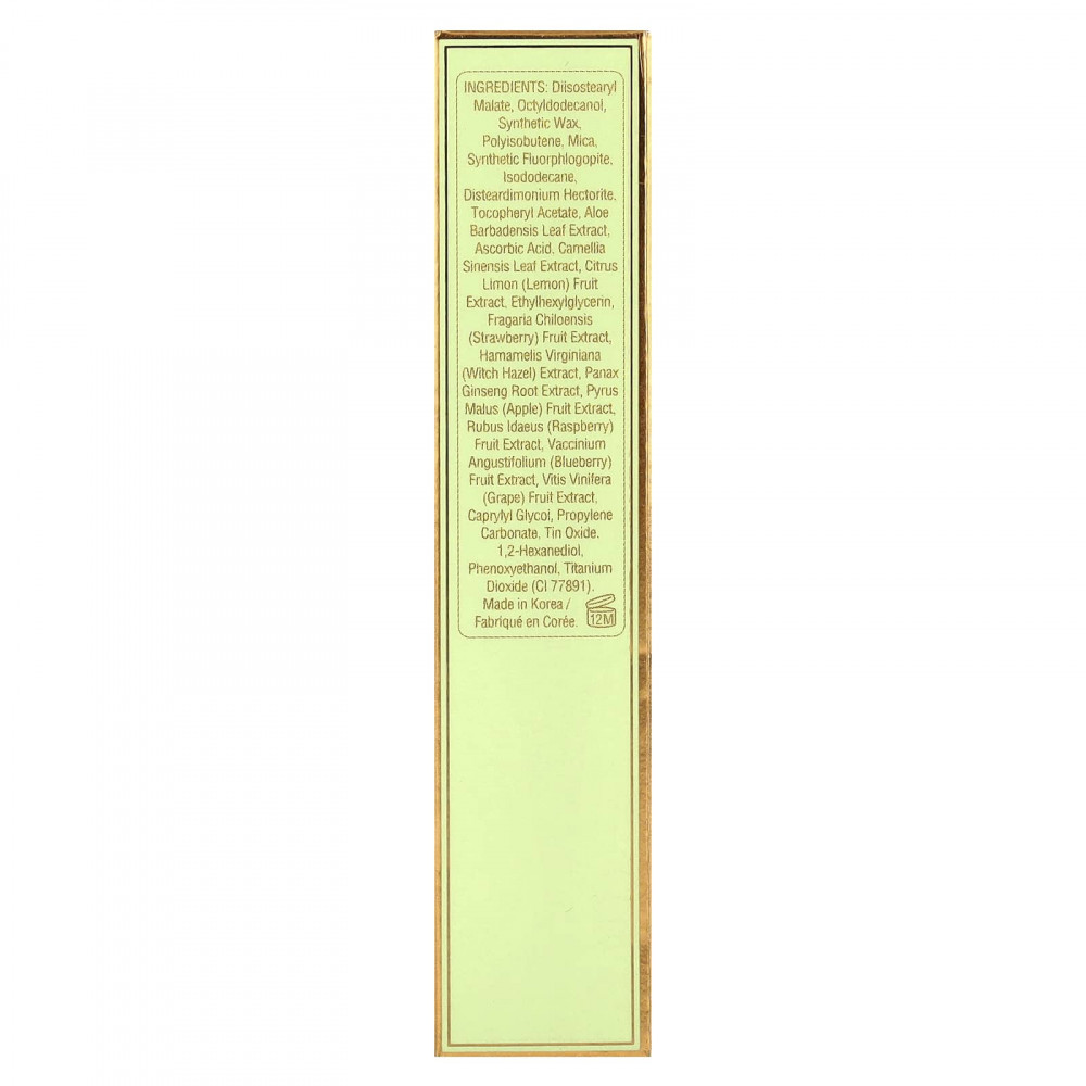 Диизостеарил малат, октилдодеканол, синтетический воск. полиизобутен, слюда, синтетический фторфлогопит, изододекан, дистеардимониум гекторит. токоферилацетат, экстракт листьев алоэ вера (Aloe barbadensis), аскорбиновая кислота, экстракт листьев зеленого чая (Camellia sinensis), экстракт плодов лимона (Citrus limon), этилгексилглицерин, экстракт ягод клубники (Fragaria chiloensis), экстракт гамамелиса (Hamamelis virginiana), экстракт корня женьшеня (Panax ginseng), экстракт яблока (Pyrus malus), экстракт ягод малины (Rubus idaeus), экстракт ягод голубики (Vaccinium angustifolium), экстракт плодов винограда (Vitis vinifera), каприлилгликоль, пропиленкарбонат, оксид олова. 1,2-гександиол, феноксиэтанол, диоксид титана (CI 77891).