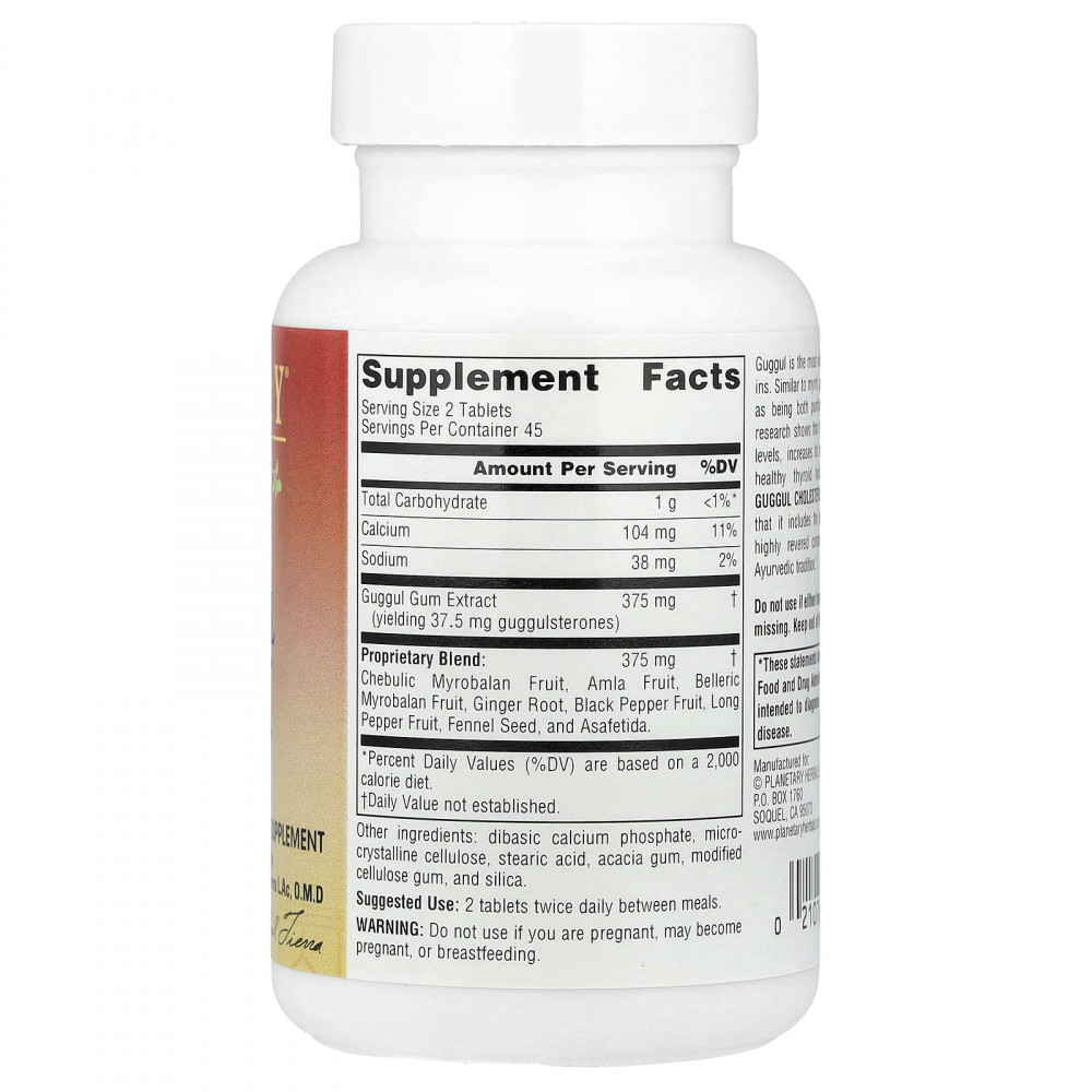 Гуггул — наиболее широко используемая из всех аюрведических смол. Как и мирра, гуггул традиционно считается очищающим и омолаживающим средством. Современные исследования показывают, что он поддерживает здоровый уровень холестерина, увеличивает метаболизм жиров и способствует здоровой функции щитовидной железы. Смесь холестерина Guggul Cholesterol Compound™ от Planetary Ayurvedics уникальна тем, что в ее состав входит легендарная трифала, соединение, высоко ценимое в 5000-летней аюрведической традиции.