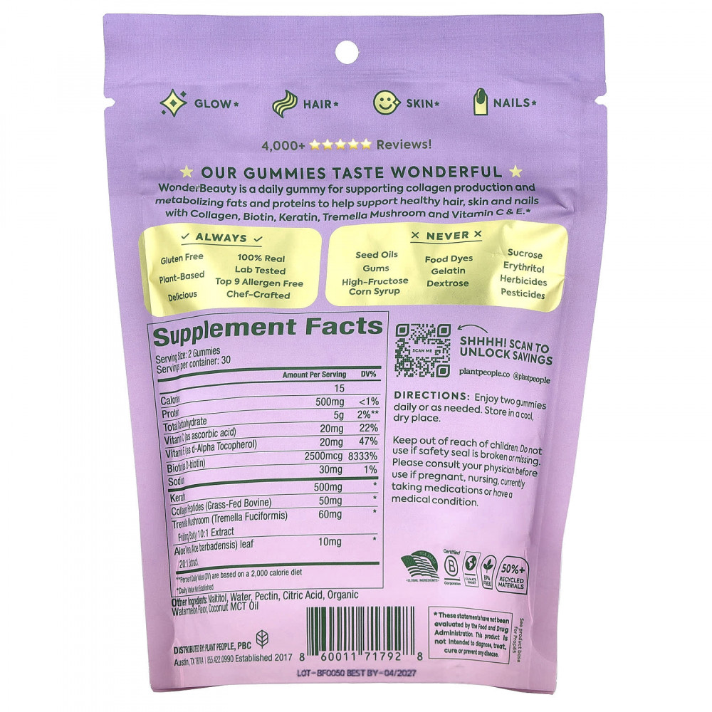 WonderBeauty — это жевательная таблетка для ежедневного приема, которая способствует выработке коллагена и метаболизму жиров и белков, поддерживает здоровье волос, кожи и ногтей с помощью коллагена, биотина, кератина, тремеллы, витаминов C и E.