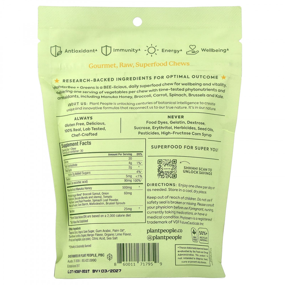 WonderBee + Greens — это жевательная таблетка с суперфудом для ежедневного приема, способствующая здоровью и жизненной силе. Она содержит одну порцию овощей с проверенными временем фитонутриентами и антиоксидантами, включая мед манука, брокколи, морковь, шпинат, брюссельскую капусту и кудрявую капусту.