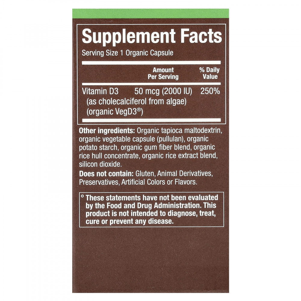 | Витамин D3 (в виде холекальциферола из водорослей) (органический VegD3®) | 50 мкг (2000 МЕ) | 250% |