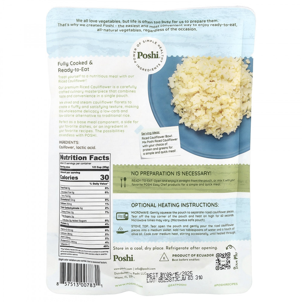 Побалуйте себя питательным блюдом благодаря нашей измельчённой цветной капусте! Наша измельчённая цветная капуста премиального качества — это тщательно продуманный кулинарный шедевр, сочетающий вкус и удобство в одном пакетике. Мы измельчаем и обрабатываем паром соцветия цветной капусты, чтобы придать им приятную пышную текстуру. Это полезное лакомство является низкоуглеводной и низкокалорийной альтернативой традиционному рису. Идеально подходит в качестве основы для блюда, гарнира к любимым блюдам или ингредиента в ваших любимых рецептах. С продуктами POSHI возможности безграничны.