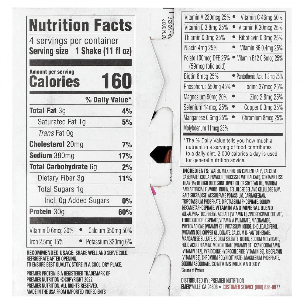 Вода, концентрат молочного протеина†, Казеинат кальция†, какао-порошок (обработанный щёлочью), содержит менее 1% высокоолеинового подсолнечного или соевого масла, натуральные и искусственные ароматизаторы, инулин, целлюлозный гель и целлюлозная камедь, соль, сукралоза, ацесульфам калия, каррагинан, трикалийфосфат, дикалийфосфат, гексаметафосфат натрия, смесь витаминов и минералов (dl-альфа-токоферилацетат [витамин E], хелат глицината цинка, ортофосфат железа, витамин A (пальмитат), никотинамид, фитонадион [витамин K1], йодид калия, холекальциферол [витамин D3], глюконат меди, d-пантотенат кальция, сульфат марганца, селенит натрия, биотин, молибдат натрия, фолиевая кислота, мононитрат тиамина [витамин B1], цианокобаламин [витамин B12], пиридоксина гидрохлорид [витамин B6], рибофлавин [витамин B2], полиникотинат хрома), фосфат магния, аскорбат натрия.