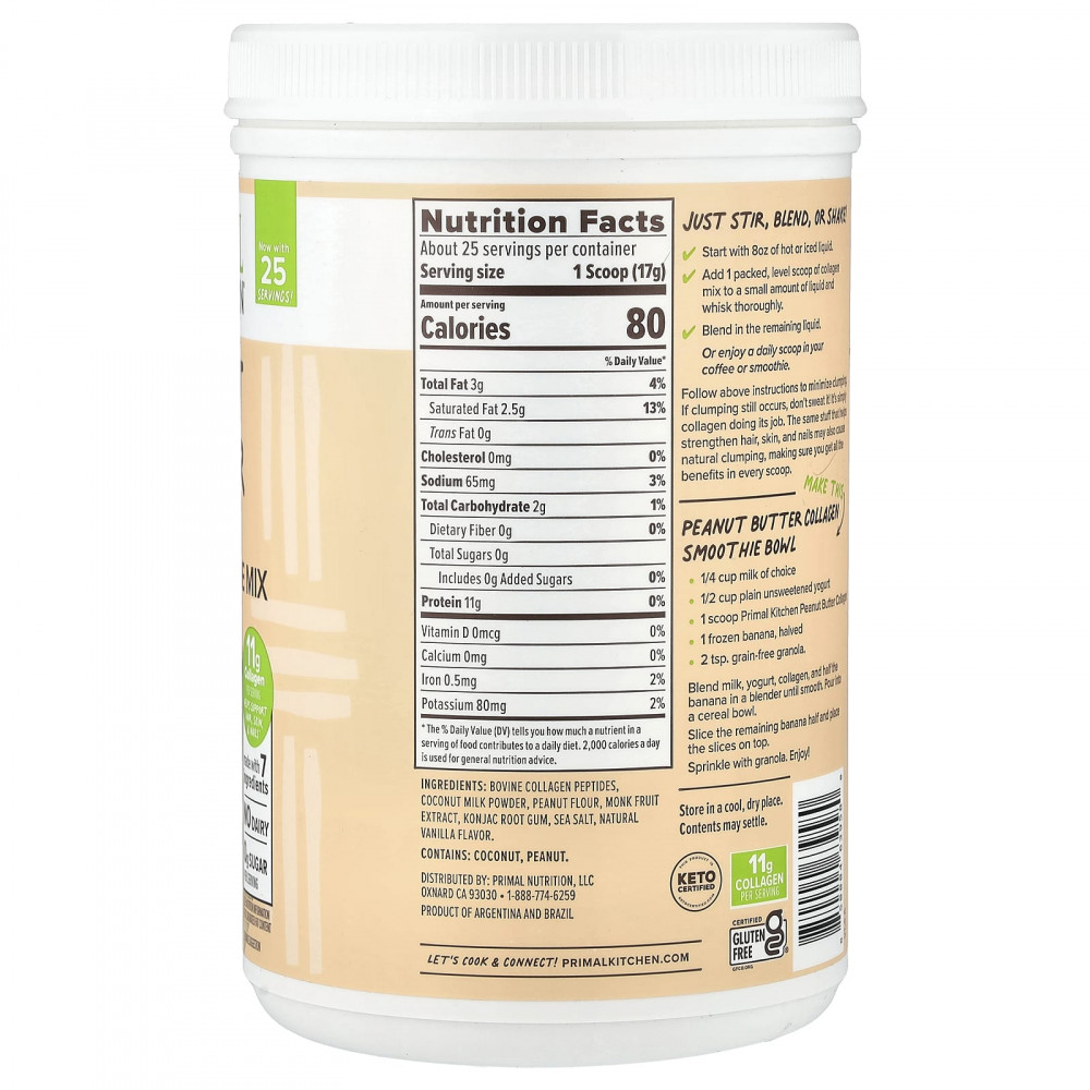 Пептиды бычьего коллагена, порошок из кокосового молока, арахисовая мука, Экстракт архата, камедь корня конжака, морская соль, натуральный ароматизатор «Ваниль».