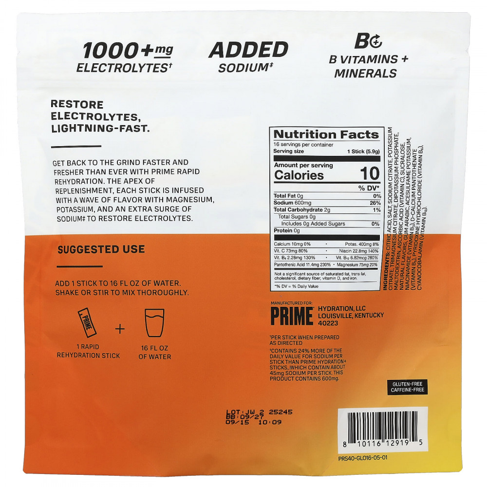 ‡ Содержит на 24% больше суточной нормы натрия в одном стике, чем стики Prime Hydration+, которые содержат около 45 мг натрия в 1 стике. Этот продукт содержит 600 мг