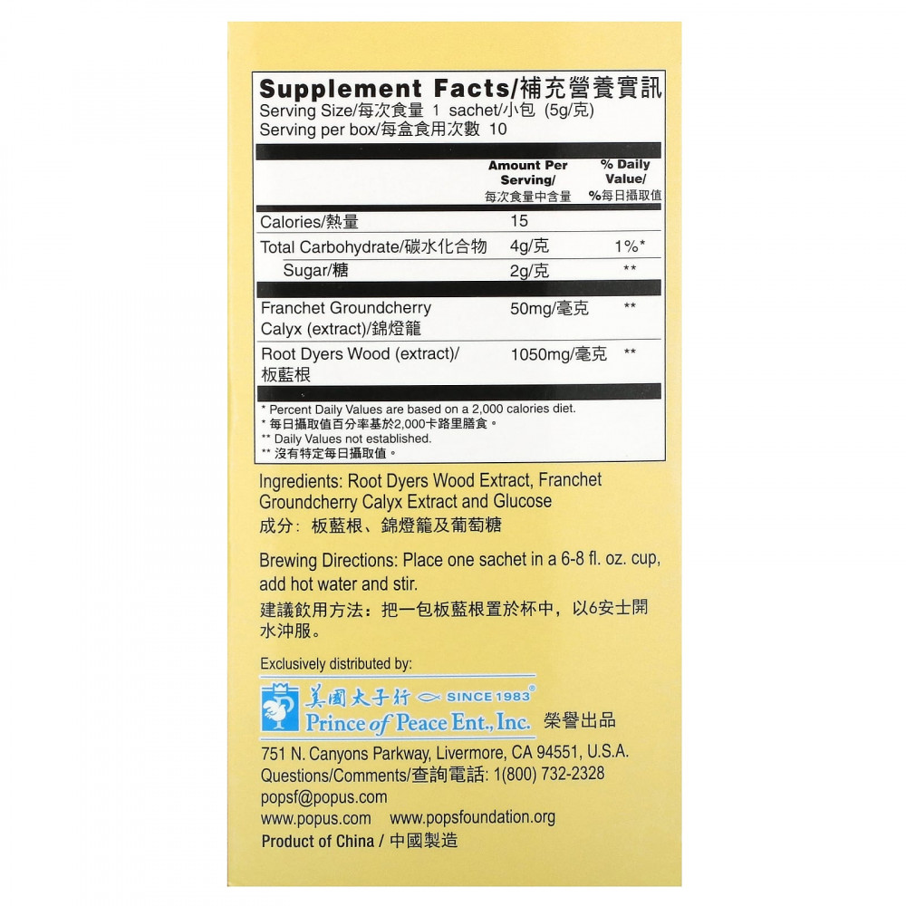 Prince Gold® Ban Lan Gen разработан экспертами, специализирующимися на традиционных китайских добавках. Наша формула высококонцентрированная. Содержимое каждого саше получено из 11 г качественного необработанного дерева красильщиков (Ban Lan Gen.)