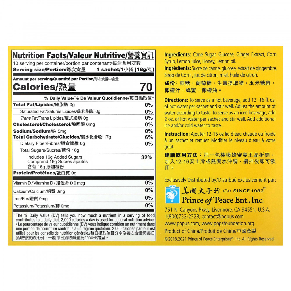 Кристаллы с медом, лимоном и имбирем (индивидуальное саше) Prince of Peace® предлагает вам все натуральные полезные свойства имбиря и меда в нашей специальной запатентованной смеси кристаллов меда, имбиря и лимона. Каждый саше содержит концентрированный экстракт из 14 граммов необработанного имбиря, который создает приятный аромат и изысканно мягкий вкус. Натуральный сладкий и пряный вкус этого напитка делает его любимым напитком круглый год. Не беспокойтесь, этот продукт не содержит кофеина. В горячем виде он согревает изнутри. Он также имеет прекрасный вкус со льдом!