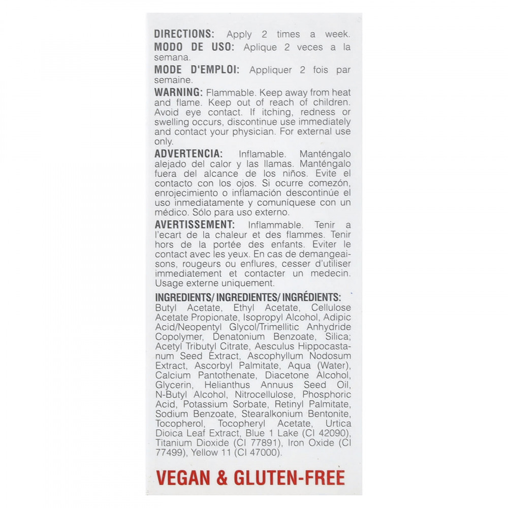 Бутилацетат, этилацетат, пропионат ацетата целлюлозы, изопропиловый спирт, адипиновая кислота/неопентилгликоль/тримеллитовый гидрид сополимер, бензоат денатония, диоксид кремния; ацетил трибутилцитрат, экстракт семян овса (Aesculus hippocastanum), Экстракт аскофиллума узловатого, аскорбил пальмитат, вода, пантотенат кальция, диацетоновый спирт, глицерин, подсолнечное масло (Helianthus annuus), н-бутиловый спирт, нитроцеллюлоза, фосфорная кислота, сорбат калия, ретинилпальмитат, бензоат натрия, стеаралкония бентонит, Токоферол, токоферилацетат, экстракт листьев крапивы двудомной (Urtica dioica), краситель синий 1 лак (CI 42090), Диоксид титана (CI 77891), оксид железа (CI 77499), краситель желтый 11 (CI 47000).
