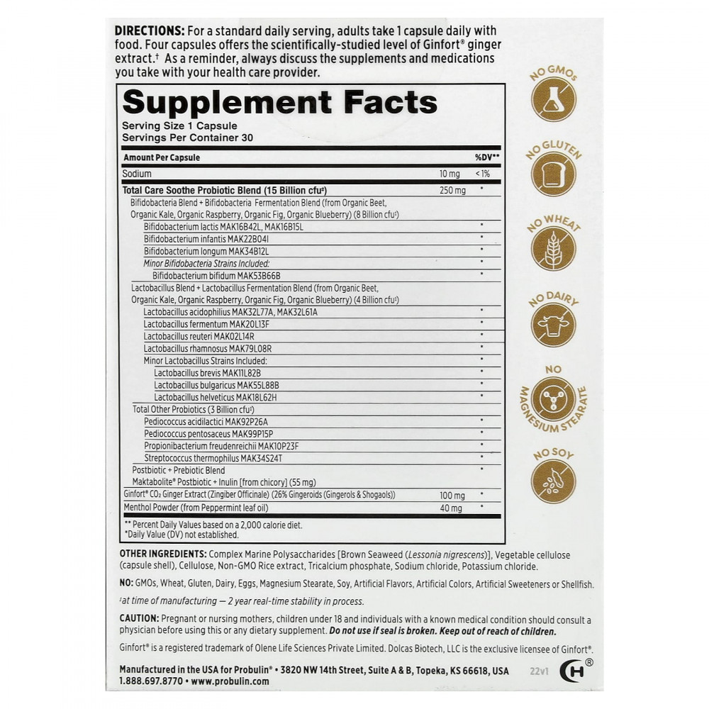 Probulin® Soothe содержит 15 штаммов пробиотиков, а также ментол с перечной мятой и концентрированный экстракт имбиря Ginfort® для оптимальной поддержки пищеварения.