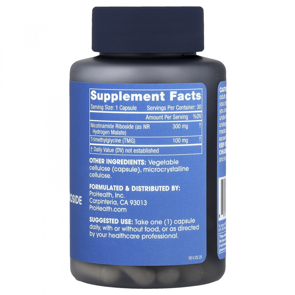Способствует здоровому метилированию. TMG является ключевым донором метильных групп, который поддерживает сбалансированный гомоцистеин и помогает поддерживать работу НАД+. Разумное дополнение при приеме NR для поддержания запасов метильных групп.