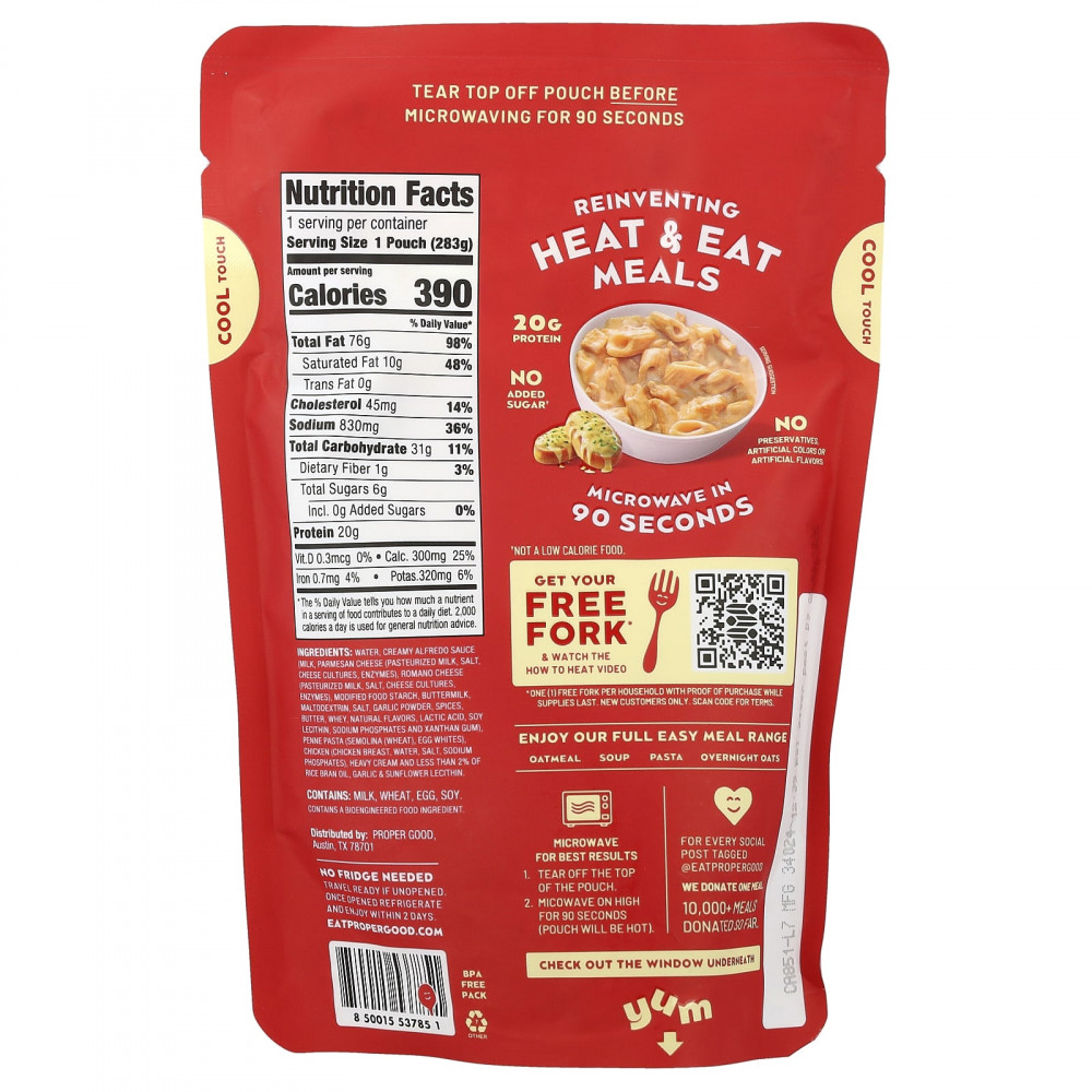 Вода, сливочный соус альфредо (молоко, сыр пармезан (пастеризованное молоко, соль, культуры для сыра, ферменты), сыр романо (пастеризованное молоко, соль, культуры для сыра, ферменты), модифицированный пищевой крахмал, пахта, мальтодекстрин, соль, чесночный порошок, специи, сливочное масло, сыворотка, натуральные ароматизаторы, молочная кислота, соевый лецитин, фосфат натрия и ксантановая камедь), паста пенне (манка (пшеница), яичный белок), курица (куриная грудка, вода, соль, фосфаты натрия), жирные сливки и менее 2% масла из рисовых отрубей, чеснок и п)одсолнечный лецитин.