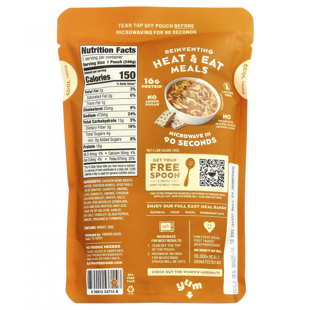 Бульон из куриных костей (вода, куриные кости), овощной бульон (вода, морковь, лук, лук-порей), морковь, лук, курица (куриная грудка, вода, соль), сельдерей, яичная лапша (манка, яйца и яичный белок) и менее 2% желатина, чеснок, морская соль, петрушка, черный перец, имбирь, орегано и и к)уркума.