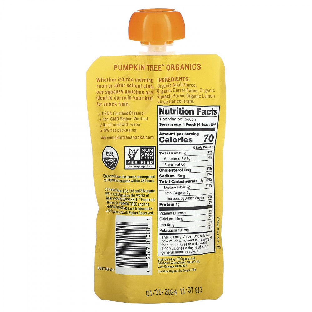 Органическое яблочное пюре, пюре из органической моркови, органическое пюре из тыквы, концентрат органического лимонного сока.