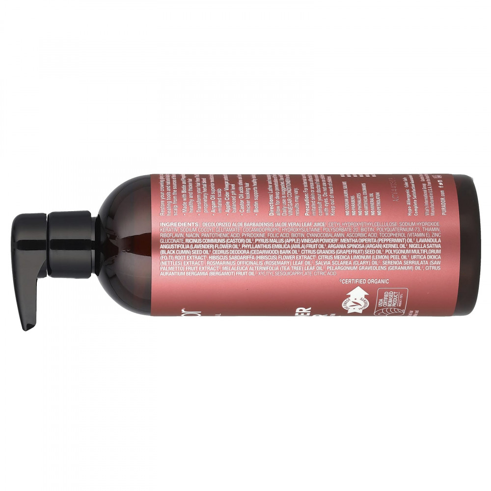 Обесцвеченный сок листьев алоэ вера (Aloe barbadensis)*, цетил гидроксиэтилцеллюлоза, гидроксид натрия, кератин, кокоил глутамат натрия, кокамидопропил гидроксисултаин, полисорбат 20, биотин, поликватерниум-73, тиамин, рибофлавин, ниацин, пантотеновая кислота, пиридоксин, фолиевая кислота, биотин, цианокобаламин, аскорбиновая кислота, токоферол (витамин Е), сульфат цинка, касторовое масло (Ricinus communis)*, порошок из яблочного уксуса (Pyrus malus)*, масло перечной мяты (Mentha piperita)*, масло из цветков лаванды (Lavandula angustifolia)*, масло из плодов амлы (Phyllanthus emblica)*, масло из косточек аргана (Argania spinosa)*, масло из семян черного тмина (Nigella sativa)*, масло из коры кедра (Cedrus deodara)*, масло из семян грейпфрута (Citrus grandis)*, экстракт корня горца многоцветного (Polygonum multiflorum)*, экстракт из цветков розеллы (Hibiscus sabdariffa)*, масло из цедры лимона (Citrus medica limonum)*, экстракт крапивы двудомной (Urtica dioica)*, масло из листьев розмарина (Rosmarinus officinalis)*, масло мускатного шалфея (Salvia sclarea)*, экстракт из плодов серенои (Serenoa serrrulata)*, масло из листьев чайного дерева (Melaleuca alternifolia)*, масло герани (Pelargonium graveolens)*, масло из плодов бергамота (Citrus aurantium bergamia)*, ксилитил сескикаприлат, лимонная кислота.