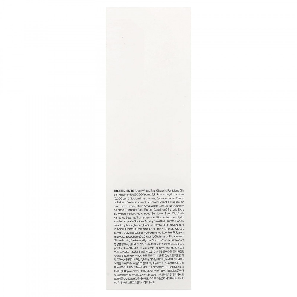 Вода (Aqua/eau), глицерин, пентилен гликоль, никотинамид (20 000 част./млн), 2,3-бутандиол, глутатион (5000 част./млн), гиалуронат натрия, экстракт продукта ферментации бактерий рода Sphingomonas, экстракт цветков дерева ним (Melia azadirachta), экстракт листьев туласи (Ocimum sanctum), экстракт листьев дерева ним (Melia azadirachta), экстракт корня куркумы (Curcum longa), экстракт кораллины лекарственной (Corallina officinalis), ксилоза, подсолнечное масло (Helianthus annuus), 1,2-гександиол, бетаин, трометамин, глюконолактон, гидроксиэтил акрилат/натрия акрилоилдиметилтаурата сополимер, этилгексилглицерин, цитрат натрия, 3-o-этил-аскорбиновая кислота (100 част./млн), лимонная кислота, кроссполимер гиалуроната натрия, бутиленгликоль, гидрогенизированный лецитин, полиглутаминовая кислота, токоферол (0,259 част./млн), холестерина, дикалия глицирризат, цистеин, глицин, кокоил изетионат натрия.