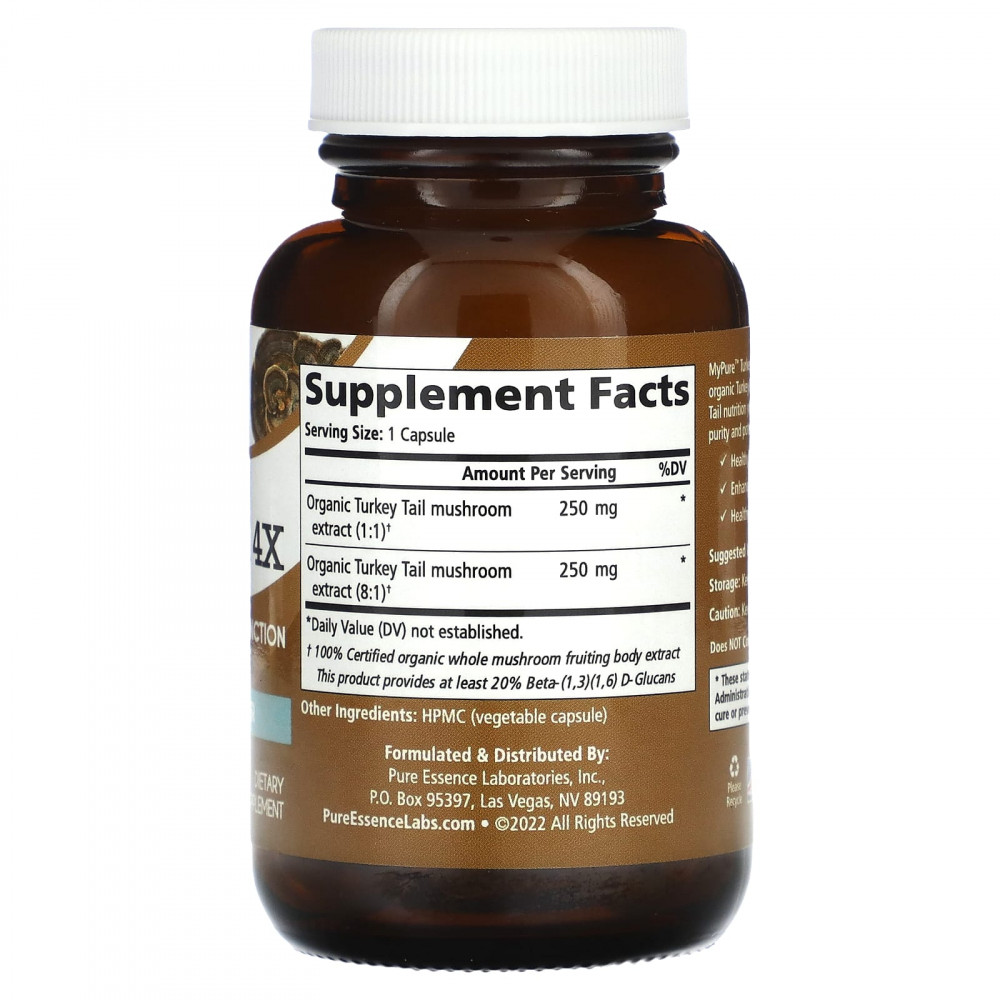 Экстракт трутовика индейки MyPure™ 4X сочетает в себе экстракты сертифицированных органических плодовых тел трутовика индейки в соотношении 1:1 и 8:1, чтобы обеспечить самое эффективное питательное вещество трутовика разноцветного. Каждая партия проходит лабораторные испытания на чистоту, чистоту и эффективность. Трутовик разноцветный поддерживает: