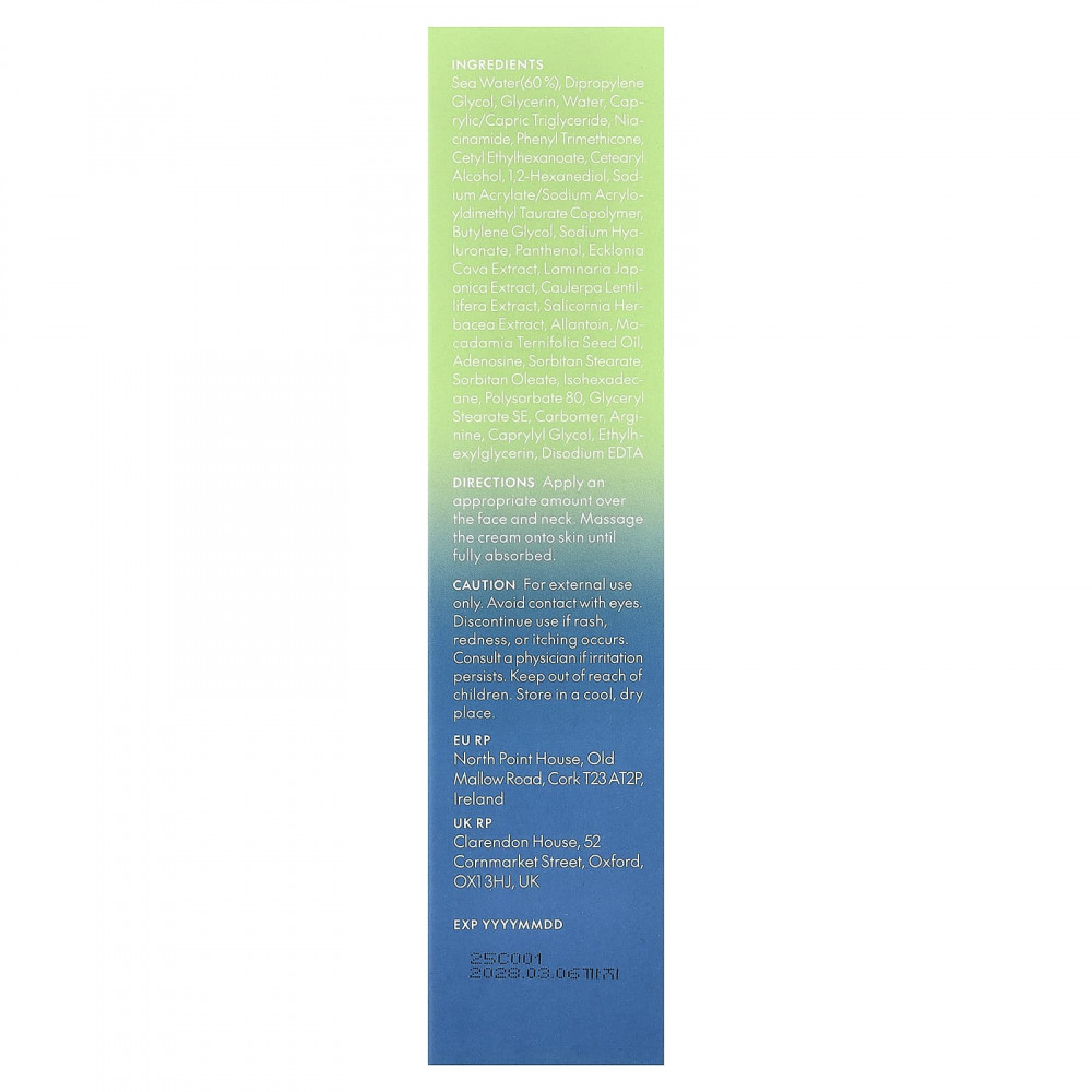 Морская вода (60%), дипропиленгликоль, глицерин, вода, каприловый/каприновый триглицерид, никотинамид, фенилтриметикон, цетилэтилгексаноат, цетеариловый спирт, 1,2-гександиол, натрий акрилат/натрий акрилоилдиметилтаурат сополимер, бутиленгликоль, гиалуронат натрия, пантенол, экстракт водоросли эклонии кавы (Ecklonia cava), экстракт ламинарии японской (Laminaria japonica), экстракт морского винограда (Caulerpa lentillifera), экстракт солероса европейского (Salicornia herbacea), аллантоин, масло макадамии (Macadamia ternifolia), аденозин, сорбитан стеарат, сорбитанолеат, изогексадекан, полисорбат 80, глицерил стеарат эмульгирующий, карбомер, аргинин, каприлилгликоль, этилгексилглицерин, двунатриевая ЭДТК.