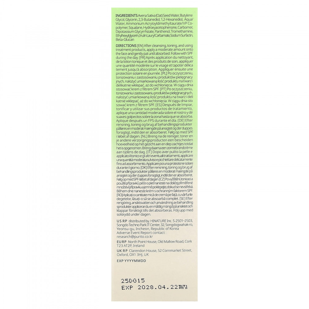 Вода из семян овса (Avena sativa), бутиленгликоль, глицерин, 2,3-бутандиол, 1,2-гександиол, вода/вода, аммоний акрилоилдиметилтаурат/ВП сополимер, сквалан, гидроксиацетофенон, карбомер, дикалия глицирризат, пантенол, трометамин, этилгексилглицерин, инулин лаурил карбамат, сурфактин натрия, бета-глюкан.