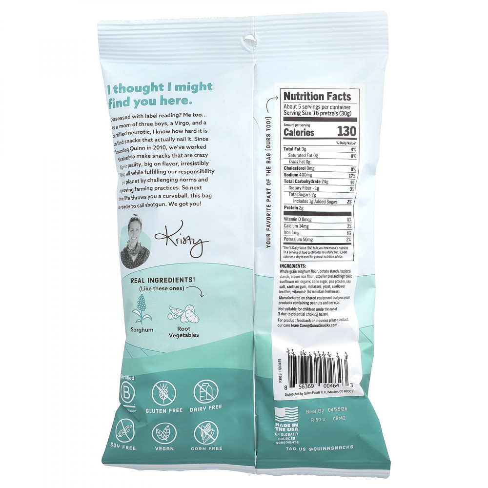 Нравится читать этикетки? Я тоже... Как мама троих мальчиков, Дева и сертифицированный невротик, я знаю, как сложно найти снеки, которые действительно помогают. С момента основания компании Quinn в 2010 году мы неустанно работаем над созданием снеков, которые являются невероятно качественными, насыщенными и невероятно сытными. При этом мы выполняем свой долг перед нашей платформой, внедряя стандарты и методы ведения сельского хозяйства. Так что в следующий раз, когда жизнь отправит вас в непредвиденные ситуации, этот мешочек будет вам по вкусу. Мы вас поняли!