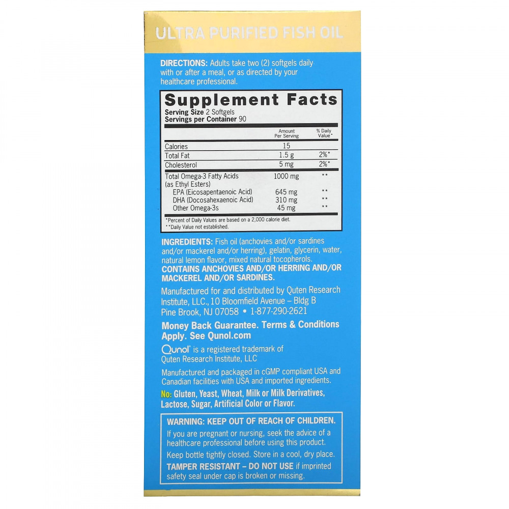 Рыбий жир Омега-3 от Qunol содержит 1000 мг омега-3 жирных кислот и жирных кислот, известных как эйкозапентаеновая кислота (ЭПК) и докозагексаеновая кислота (ДГК).