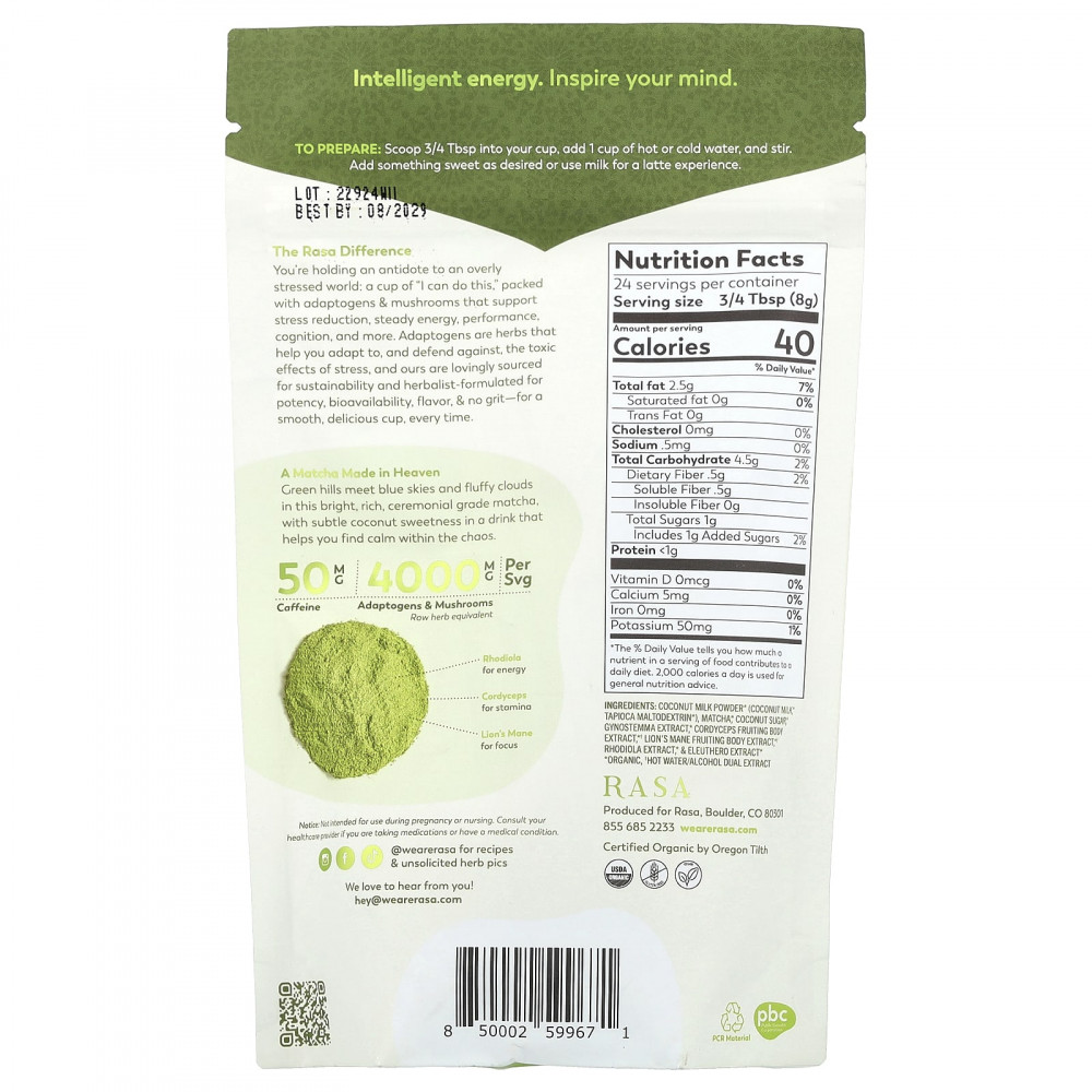 Сухое кокосовое молоко * (кокосовое молоко *, тапиока мальтодекстрин *), матча; кокосовый сахар *, экстракт гиностеммы *, экстракт плодового тела кордицепса * †, экстракт плодового тела львиной гривы * †, экстракт родиолы *, & amp; экстракт элеутерококка *.