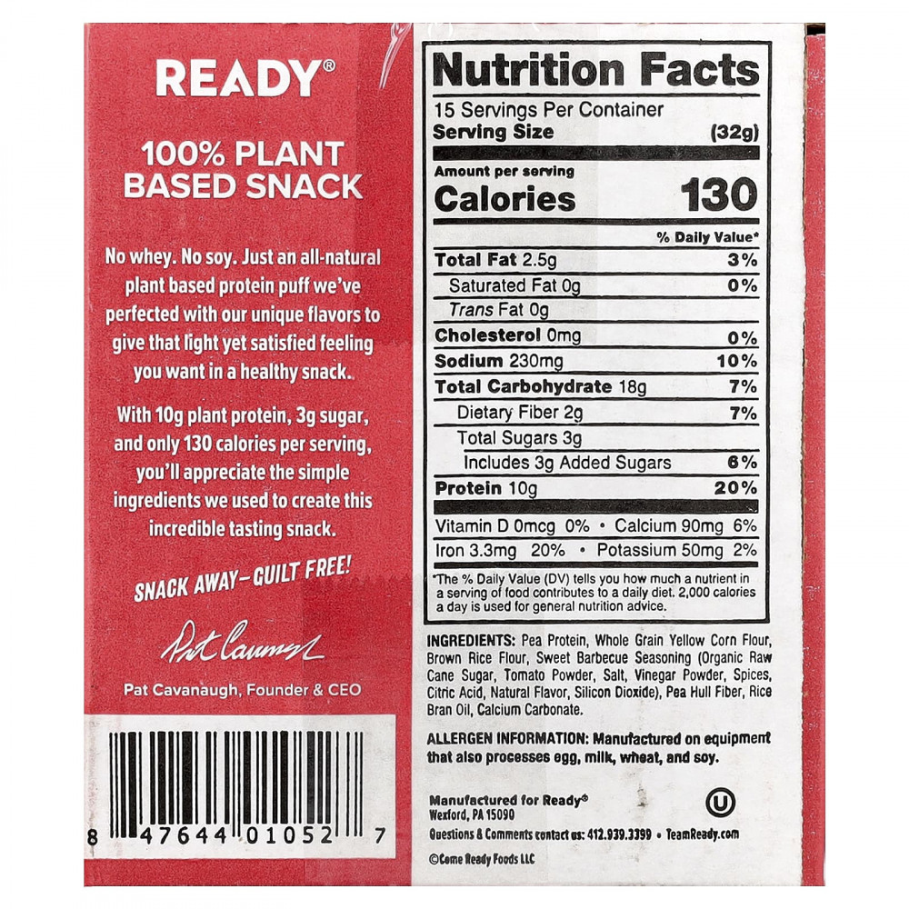 Гороховый протеин, цельнозерновая мука из желтой кукурузы, мука из коричневого риса, сладкая приправа для барбекю (органический тростниковый сахар-сырец, порошок из томатов, соль, порошок уксуса, специи, лимонная кислота, натуральный ароматизатор, диоксид кремния), гороховая клетчатка, масло из рисовых отрубей, карбонат кальция.