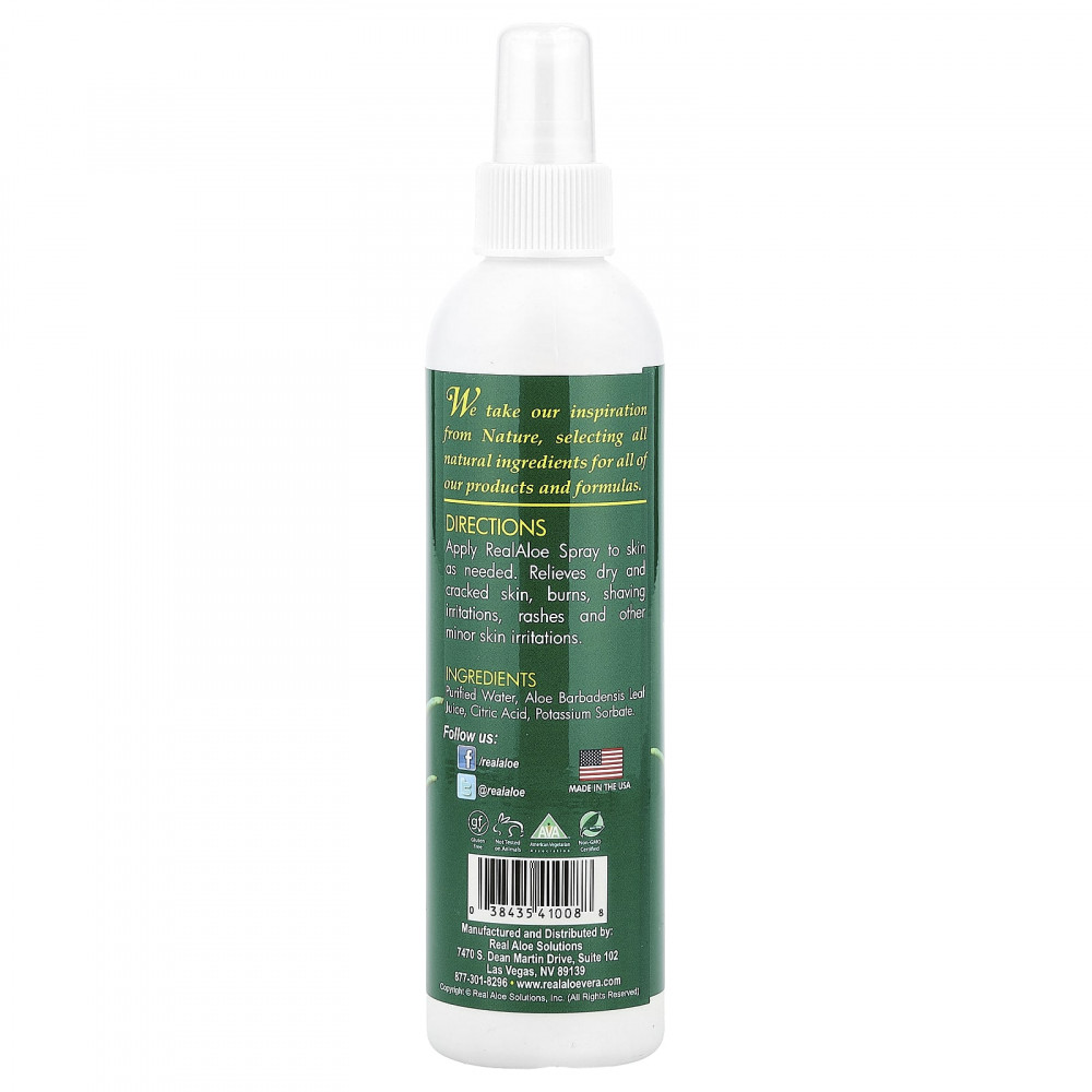 Наносите спрей RealAloe на кожу по мере необходимости. Устраняет сухость и потрескавшуюся кожу, помогает устранить ожоги, раздражения от бритья, сыпь и другие незначительные раздражения кожи.