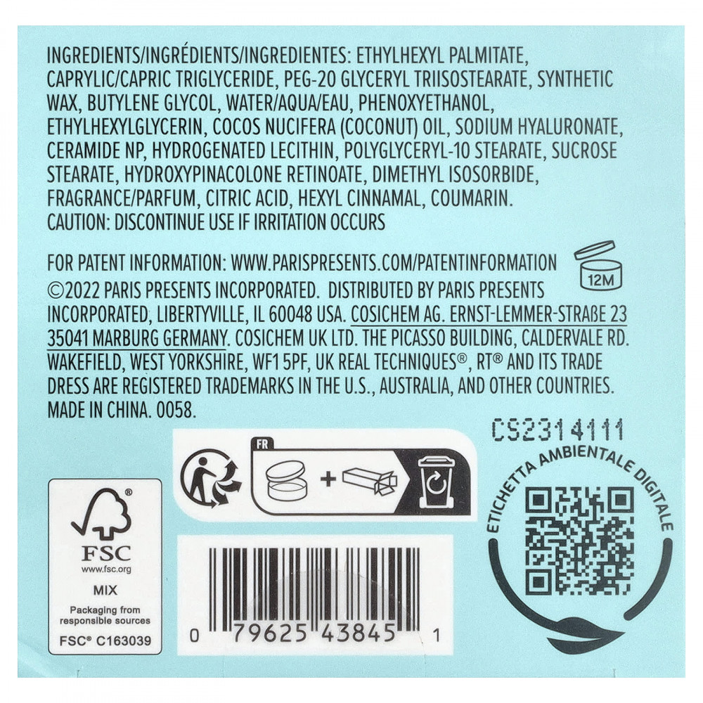 этилгексил пальмитат, каприловый/каприновый триглицерид, ПЭГ-20 глицерил триизостеарат, синтетический воск, бутиленгликоль, вода/aqua/eau, феноксиэтанол, этилгексилглицерин, кокосовое масло (Cocos nucifera), гиалуронат натрия. керамид NP, гидрогенизированный лецитин, полиглицерил-10 стеарат, стеарат сахарозы, гидроксипинаколон ретиноат, диметил изосорбид, отдушка/отдушка, лимонная кислота, гексил циннамал, кумарин.