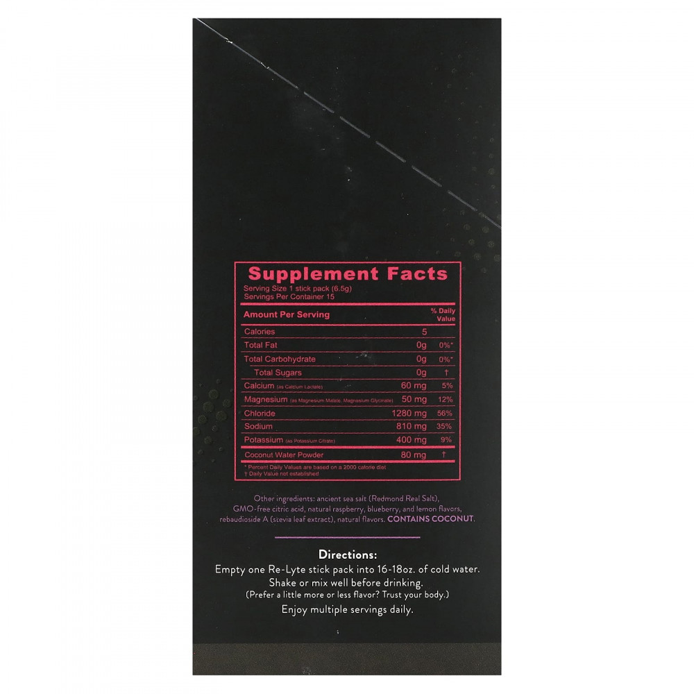 Вашему организму нужно пять незаменимых электролитов для увлажнения клеток и максимальной работы мышц. Redmond Re-Lyte® содержит идеальную смесь натрия, калия, магния, кальция и хлорида ГМО, а также порошок из кокосовой воды и натуральные микроэлементы из Redmond Real Salt®.