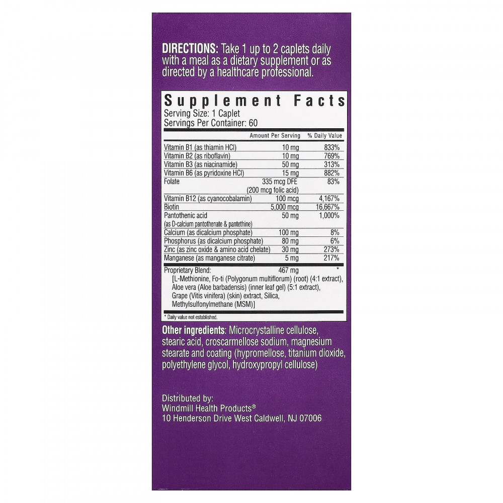 | Запатентованная смесь [L-метионин, горец многоцветковый (Polygonum multiflorum) (корень) (экстракт 4:1), алоэ вера (Aloe barbadensis) (гель из внутренней части листа) (экстракт 5:1), экстракт винограда (Vitis vinifera) (кожура) диоксид кремния, метилсульфонилметан (МСМ)] | 467 мг | * |