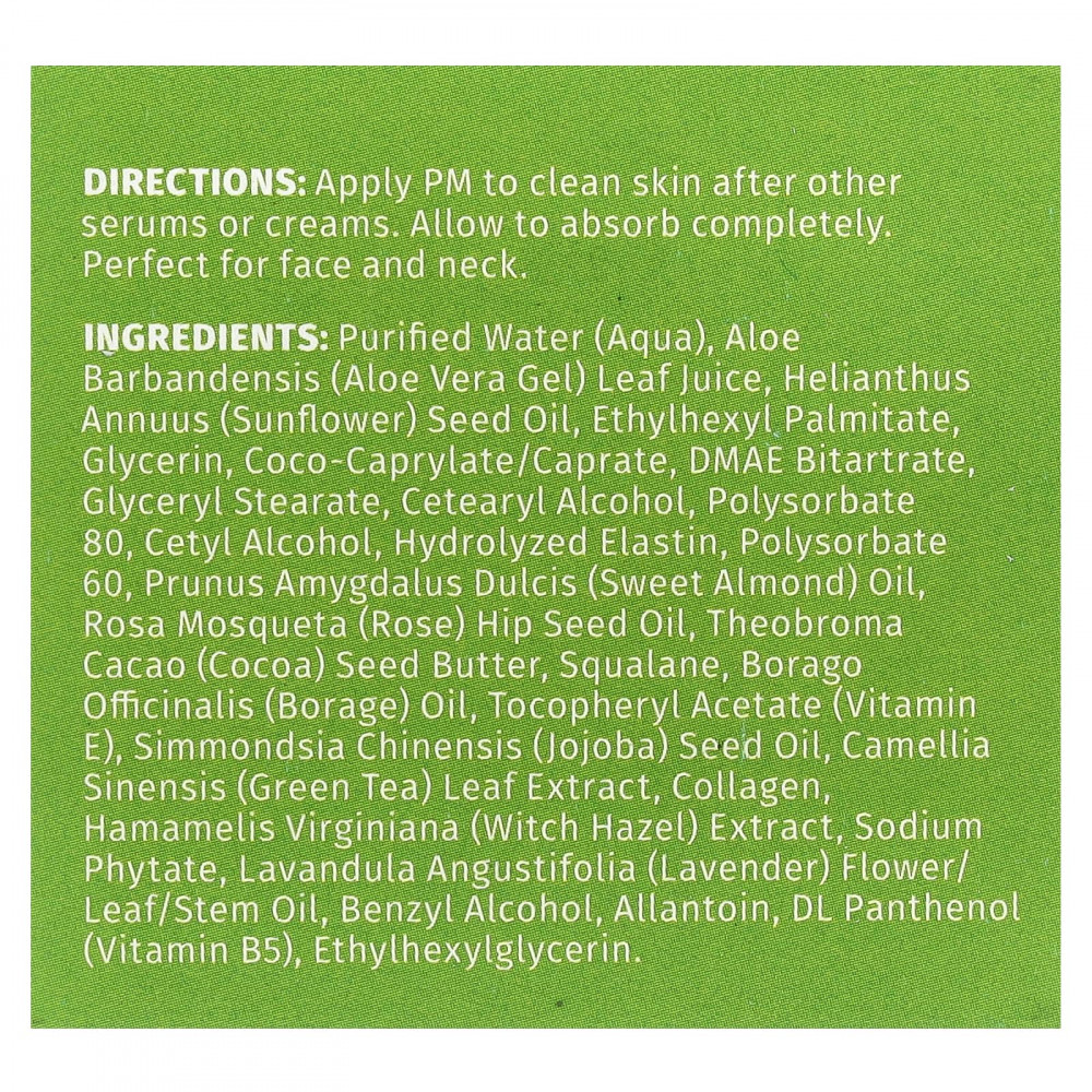 Очищенная вода, сок листьев алоэ вера (Aloe barbadensis), подсолнечное масло (Helianthus annuus), этилгексил пальмитат, глицерин, коко-каприлат/капрат, битартрат ДМАЭ, глицерил стеарат, цетеариловый спирт, полисорбат 80, цетиловый спирт, гидролизованный эластин, полисорбат 60, масло сладкого миндаля (Prunus amygdalus dulcis), масло семян шиповника (Rosa mosqueta), масло из зёрен какао (Theobroma cacao), сквалан, масло бурачника (Borago officinalis), токоферилацетат (витамин Е), масло из семян жожоба (Simmondsia chinensis), экстракт листьев зеленого чая (Camellia sinensis), коллаген, экстракт гамамелиса (Hamamelis virginiana), фитат натрия, масло из цветков/листьев и стеблей лаванды (Lavandula angustifolia), бензиловый спирт, аллантоин, дл пантенола (витамин B5), этилгексилглицерин.