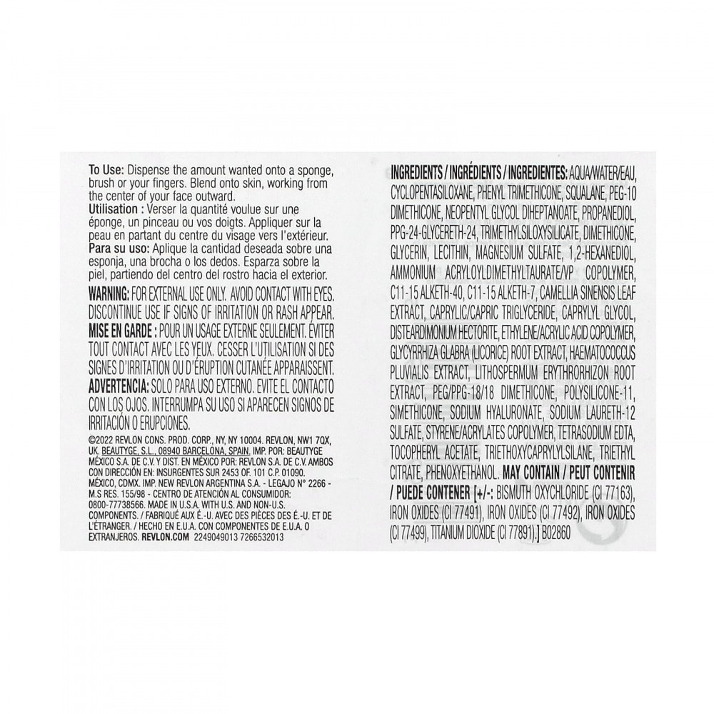 Вода, циклопентасилоксан, фенилтриметикон, сквалан, ПЭГ-10 диметикон, неопентилгликоль дигептаноат, пропандиол, ППГ-24-глицерет-24, триметилсилоксисиликат, диметикон, глицерин, лецитин, сульфат магния, 1,2-гександиол, аммоний акрилоилдиметилтаурат/ВП сополимер, c11-15 alketh-40, c11-15 alketh-7, экстракт листьев зеленого чая (Camellia sinensis), каприловый/каприновый триглицерид, каприлилгликоль, дистеардимония гекторит, сополимер этилена и акриловой кислоты, экстракт корня солодки (Glycyrrhiza glabra), экстракт гематококка дождевого (Haematococcus pluvialis), экстракт корня воробейника (Lithospermum erythrorhizon), ПЭГ/ППГ-18/18 диметикон, полисиликон-11, симетикон, гиалуронат натрия, натрия лаурет-12 сульфат, сополимер стирол/акрилаты, тетранатрия ЭДТК, токоферилацетат, триэтоксикаприлилсилан, триэтилцитрат, феноксиэтанол. Может содержать [+ / -: оксихлорид висмута (CI 77163), оксиды железа (CI 77491), оксиды железа (CI 77492), оксиды железа (CI 77499), диоксид титана (CI 77891).