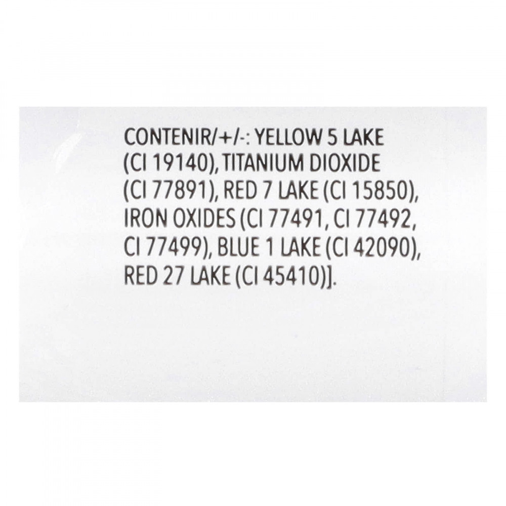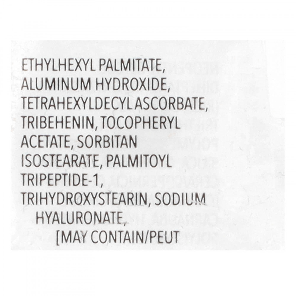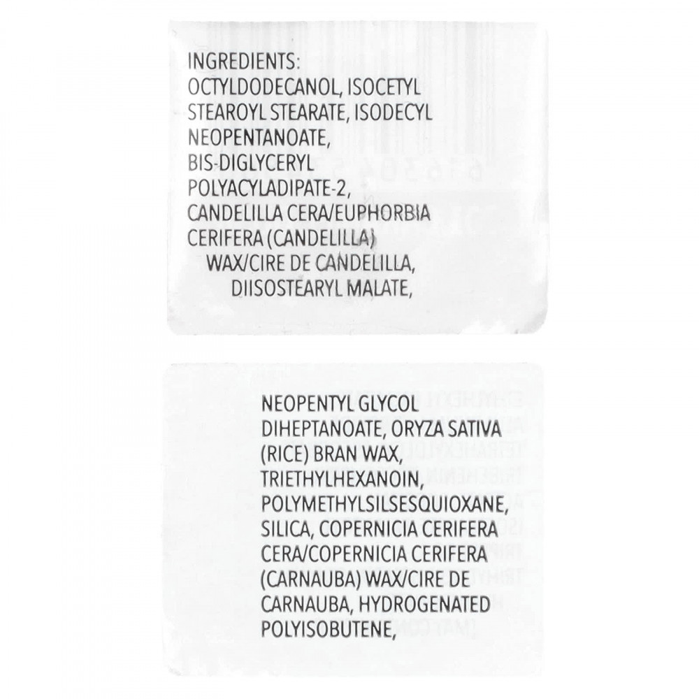 Октилдодеканол, изоцетил стеароил стеарат, изодецилнеопентаноат, бис-диглицерил полиациладипат-2, канделильский воск (Candelilla cera/Euphorbia cerifera), диизостеарил малат, неопентилгликоль дигептаноат, воск из рисовых отрубей (Oryza sativa), триэтилгексаноин, полиметилсилсесквиоксан, диоксид кремния, карнаубский воск (Copernicia cerifera), гидрогенизированный полиизобутен, этилгексил пальмитат, гидроксид алюминия, тетрагексилдецил аскорбат, трибехенин, токоферилацетат, сорбитан изостеарат, пальмитоил трипептид-1, тригидроксистеарин, гиалуронат натрия, [может содержать краситель желтый 5 лак (CI 19140), диоксид титана (CI 77891), краситель красный 7 лак (CI 15850), оксиды железа (CI 77491, CI 77492, CI 77499), краситель синий 1 лак (CI 42090), краситель красный 27 лак (CI 45410)].