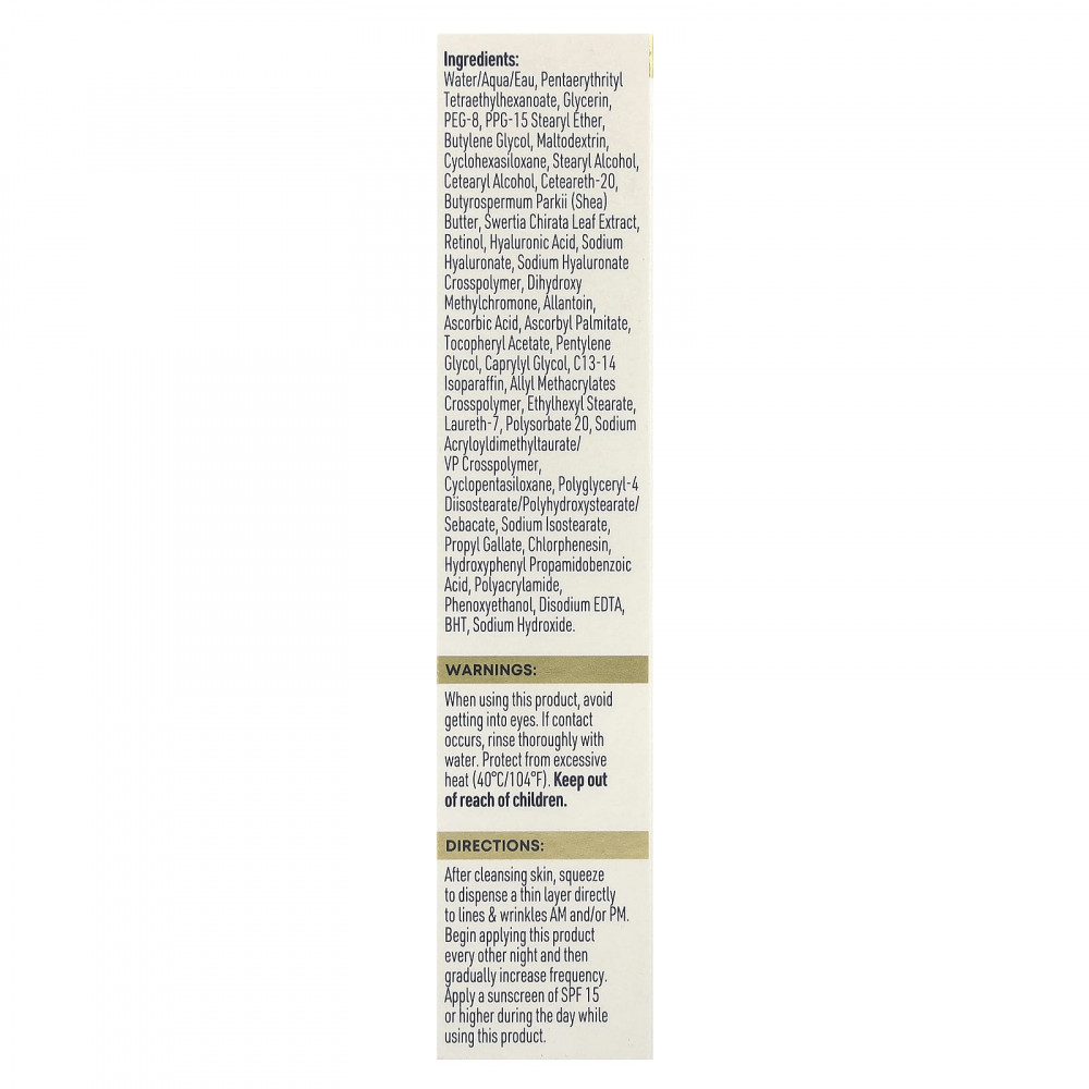 Вода, пентаэритритил тетраэтилгексаноат, глицерин, ПЭГ-8, ППГ-15 стеариловый эфир, бутиленгликоль, мальтодекстрин, циклогексасилоксан, стеариловый спирт, цетеариловый спирт, цетеарет-20, масло ши (Butyrospermum parkii), экстракт листьев сверции хирата, ретинол, гиалуроновая кислота, гиалуронат натрия, кроссполимер гиалуроната натрия, дигидроксиметилхромон, аллантоин, аскорбиновая кислота, аскорбил пальмитат, токоферилацетат, пентилен гликоль, каприлилгликоль, c13-14 изопарафин, кроссполимер аллилметакрилата, этилгексил стеарат, лаурет-7, полисорбат 20, акрилоилдиметилтаурат натрия / ВП кроссполимер, циклопентасилоксан, полиглицерил-4-диизостеарат / полигидроксистеарат / себацат, изостеарат натрия, пропилгаллат, хлорфенезин, гидроксифенилпропамидобензойная кислота, полиакриламид, феноксиэтанол, двунатриевая ЭДТК, бутилгидрокситолуол, гидроксид натрия.