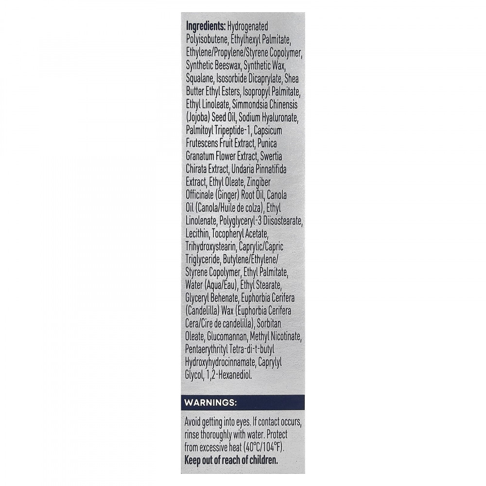 Гидрогенизированный полиизобутен, этилгексил пальмитат, сополимер этилена/пропилена/стирола, синтетический пчелиный воск, синтетический воск, сквалан, изосорбид дикаприлат, этиловые эфиры масла ши, изопропилпальмитат, этил линолеат, Масло семян Simmondsia chinensis (Jojoba), гиалуронат натрия, пальмитоил трипептид-1, экстракт плодов кайенского перца (Capsicum frutescens), Экстракт цветков гранаты пуники, экстракт сверции (Swertia chirata), экстракт ундарии перистой (Undaria pinnatifida), этилолеат, масло корня имбиря (Zingiber officinale), рапсовое масло, этил линоленат, полиглицерил-3 диизостеарат, лецитин, токоферилацетат, тригидроксистеарин, каприловый/каприновый триглицерид, сополимер бутилена/этилена/стирола, этилпальмитат, Вода, этил стеарат, глицерил бегенат, Воск молочая (Candelilla), сорбитанолеат, глюкоманнан, метил никотинат, пентаэритритил тетра-ди-т-бутилгидроксициннамат, каприлилгликоль, 1,2-гександиол