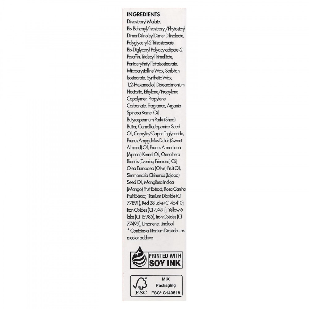 Дистеарил малат, бис-бегенил/изостеарил/фитостерил димер дилинолеил димер дилинолеат, полиглицерил-2 триизостеарат, бис-диглицерил полиациладипат-2, парафин, тридецилтримеллитат, пентаэритритил тетраизостеарат, микрокристаллический воск, сорбитан изостеарат, синтетический воск, 1,2-гександиол, Disteardimonium hectorite, сополимер этилена/пропилена, пропиленкарбонат, аромат, Масло косточек аргании спинозы, Масло Butyrospermum parkii (Ши), масло из семян камелии японской (Camellia japonica), каприловый/каприновый триглицерид, Масло сладкого миндаля, масло из косточек абрикоса (Prunus armeniaca), масло примулы вечерней (Oenothera biennis), Оливковое масло, Масло семян Simmondsia chinensis (Jojoba), экстракт плодов манго (Mangifera indica), экстракт плодов шиповника (Rosa canina), Диоксид титана (CI 77891), краситель красный 28 лак (CI 45410), оксиды железа (CI 77491), краситель желтый 6 лак (CI 15985), оксиды железа (CI 77499), лимонен, линалоол.