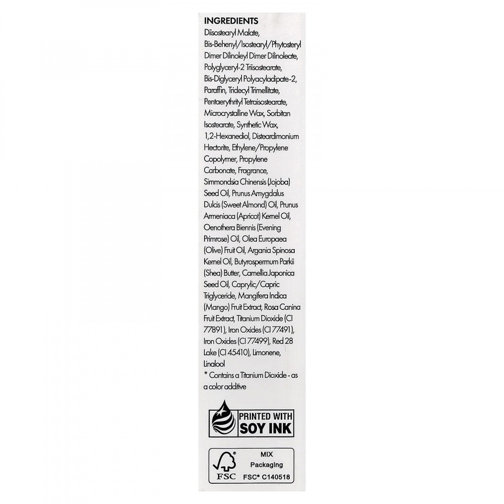 Диизостеарил малат, бис-бегенил/изостеарил/фитостерил димер дилинолеил димер дилинолеат, полиглицерил-2 триизостеарат, бис-диглицерил полиациладипат-2, парафин, тридецилтримеллитат, пентаэритритил тетраизостеарат, микрокристаллический воск, сорбитан изостеарат, синтетический воск, 1,2-гександиол, Disteardimonium hectorite, сополимер этилена/пропилена, пропиленкарбонат, аромат, Масло семян Simmondsia chinensis (Jojoba), Масло сладкого миндаля, масло из косточек абрикоса (Prunus armeniaca), масло примулы вечерней (Oenothera biennis), Оливковое масло, Масло косточек аргании спинозы, Масло Butyrospermum parkii (Ши), масло из семян камелии японской (Camellia japonica), каприловый/каприновый триглицерид, экстракт плодов манго (Mangifera indica), экстракт плодов шиповника (Rosa canina), Диоксид титана (CI 77891), оксиды железа (CI 77491), оксиды железа (CI 77499), краситель красный 28 лак (CI 45410), лимонен, линалоол.