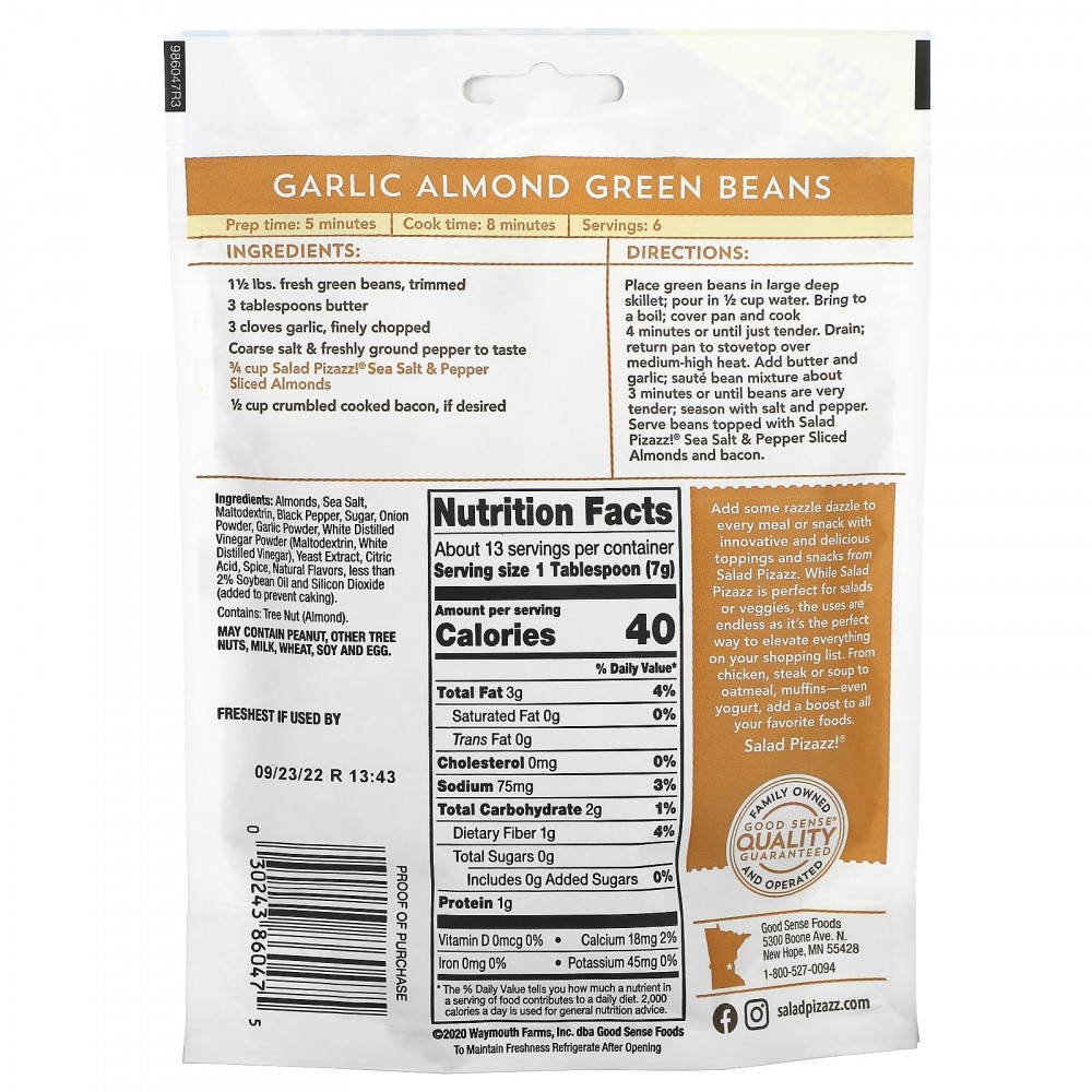 Миндаль, морская соль, мальтодекстрин, черный перец, сахар, луковый порошок, чесночный порошок, порошок белого дистиллированного уксуса (мальтодекстрин, белый дистиллированный уксус), дрожжевой экстракт, лимонная кислота, специи, натуральные ароматизаторы, менее 2% соевого масла и диоксида кремния (добавлено для предотвращения слеживания).