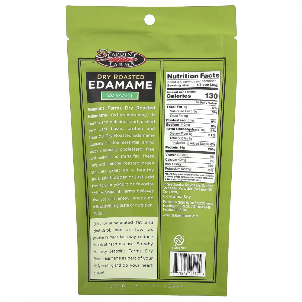 Сушеные обжаренные бобы эдамаме (ed-ah-mah-may) от Seapoint Farms полезные и вкусные, а также богатые растительным белком и клетчаткой. Наши сушеные обжаренные бобы эдамаме содержат все незаменимые аминокислоты и от природы не содержат холестерина и трансжиров. Эти хрустящие обжаренные зеленые бобы с ореховым вкусом отлично подходят в качестве полезного снека, а также добавки для салата, йогурта или любимой смеси из сухофруктов и орехов. В компании Seapoint Farms уверены, что вы можете наслаждаться снеком, не жертвуя вкусовыми качествами и питательными веществами. НАСЛАЖДАЙТЕСЬ!