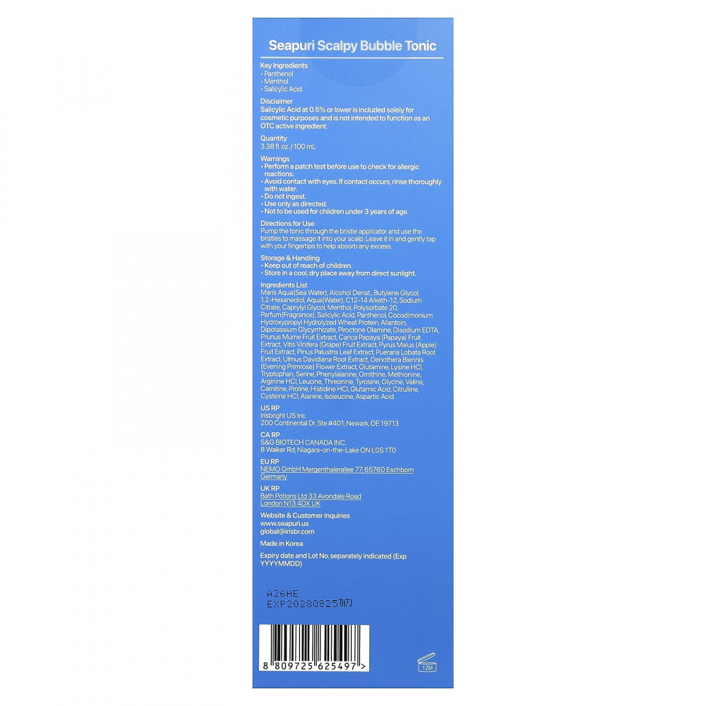 Maris aqua (морская вода), денатурированный спирт, бутиленгликоль, 1,2-гександиол, вода, c12-14 алкет-12, цитрат натрия, каприлилгликоль, ментол, полисорбат 20, парфюмерная композиция (отдушка), салициловая кислота, пантенол, гидроксипропил кокодимония, гидролизованный белок пшеницы, Аллантоин, глицирризат дикалия, пироктон оламин, Динатрия ЭДТА, экстракт плодов японского абрикоса (Prunus mume), экстракт плодов папайи (Carica papaya), экстракт плодов винограда (Vitis vinifera), экстракт яблока (Pyrus malus), экстракт хвои сосны болотной (Pinus palustris), экстракт корней пуэрарии дольчатой (Pueraria lobata), экстракт корня вяза Давида (Ulmus davidiana), экстракт цветков примулы вечерней (Oenothera biennis), глутамин, лизин гидрохлорид, триптофан, серин, Фенилаланин, орнитин, метионин, аргинин гидрохлорид, лейцин, треонин, тирозин, глицин, Валин, карнитина, Пролин, гистидин гидрохлорид, глутаминовая кислота, цитруллин, цистеин гидрохлорид, Аланин, Изолейцин, аспарагиновая кислота.