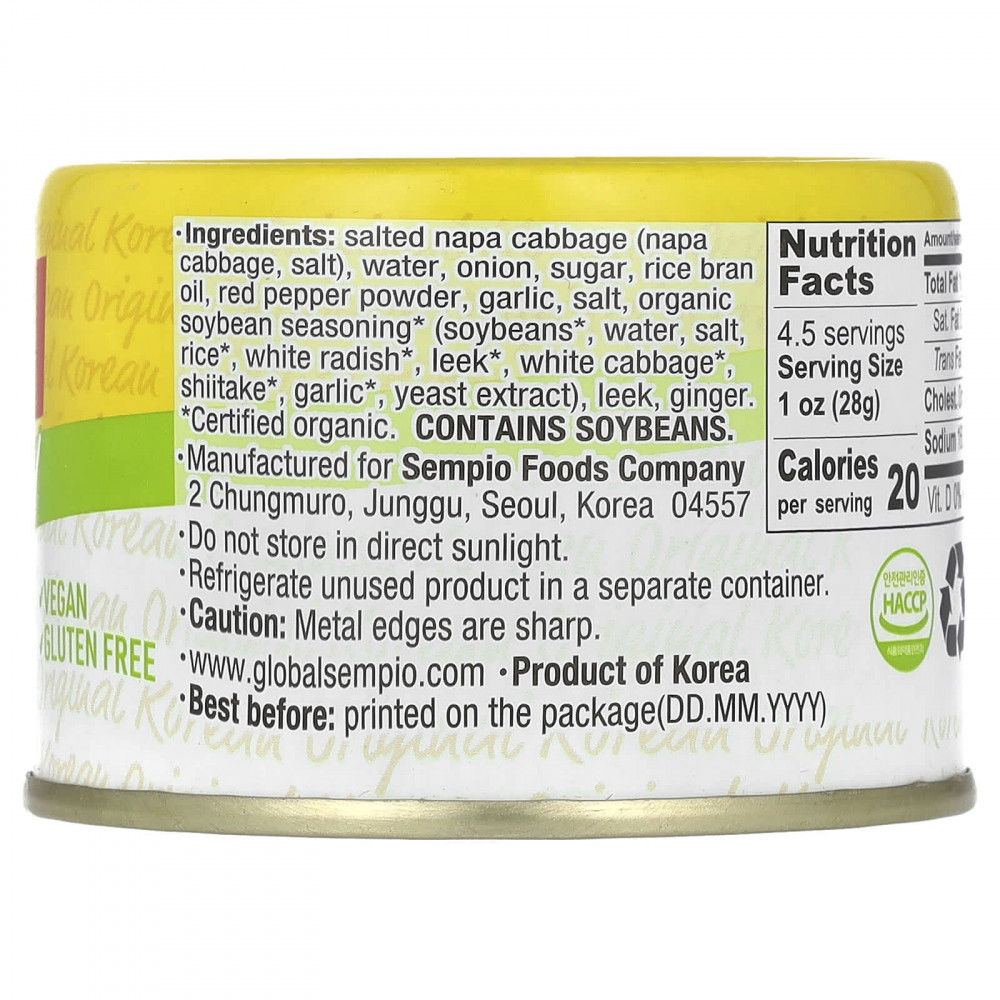Соленая капуста напа (кочанная капуста, соль), вода, лук, сахара, масло из рисовых отрубей, порошок из красного перца, чеснок, соль, органическая соевая приправа* (соевые бобы*, вода, соль, рис*, белый редис*, лук-порей*, белокочанная капуста*, шиитаке* чеснок*, экстракт дрожжей), лук-порей, имбирь.