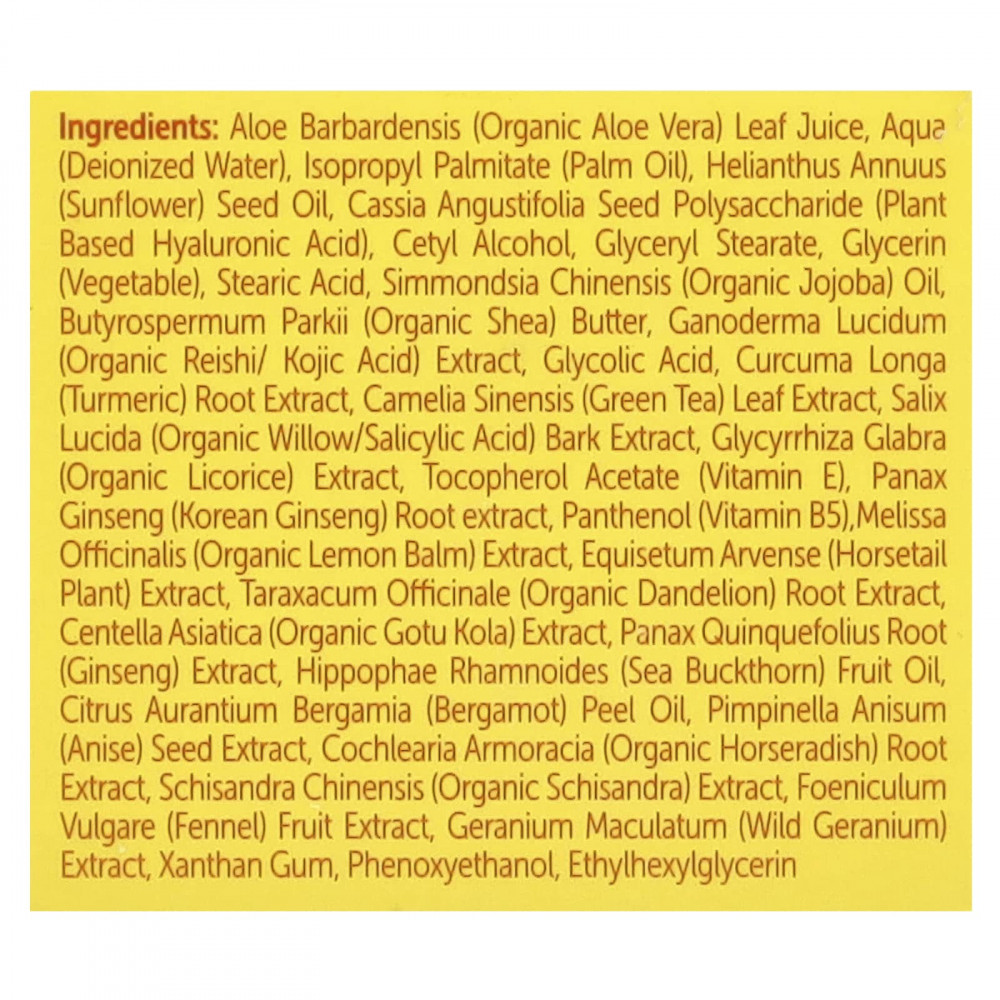 сок листьев органического алоэ вера (Aloe barbadensis), вода (деионизированная вода), изопропилпальмитат (пальмовое масло), подсолнечное масло (Helianthus annuus), полисахарид из семян сенны александрийской (Cassia angustifolia) (растительная гиалуроновая кислота), цетиловый спирт, глицерил стеарат, глицерин (растительный), стеариновая кислота, органическое масло жожоба (Simmondsia chinensis), органическое масло ши (Butyrospermum parkii), экстракт органического рейши (Ganoderma lucidum), гликолевая кислота, экстракт корня куркумы (Curcuma longa), экстракт листьев зеленого чая (Camellia sinensis), экстракт коры органической ивы/салициловой кислоты (Salix lucida), экстракт органической солодки (Glycyrrhiza glabra), токоферола ацетат (витамин E), экстракт корня корейского женьшеня (Panax ginseng), пантенол (витамин B5), экстракт органической мелиссы лекарственной (Melissa officinalis), экстракт растения хвоща полевого (Equisetum arvense), экстракт корня органического одуванчика (Taraxacum officinale), экстракт органической готу колы (Centella asiatica), экстракт корня женьшеня (Panax quinquefolius), масло плодов облепихи (Hippophae rhamnoides), масло из цедры плодов бергамота (Aurantium bergamia), экстракт семян аниса (Pimpinella anisum), экстракт корня органического хрена (Cochlearia armacia), экстракт органического лимонника (Schisandra chinensis), экстракт плодов фенхеля (Foeniculum vulgare), экстракт герани пятнистой (Geranium maculatum), ксантановая камедь, феноксиэтанол, этилгексилглицерин.