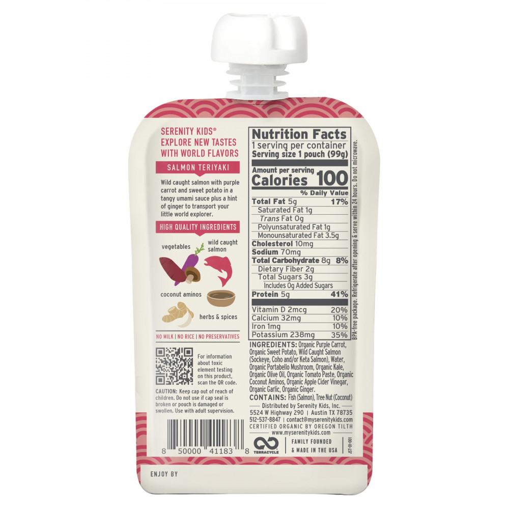 Органическая фиолетовая морковь, органический батат, лосось дикого улова (нерка, кижуча и/или кета), вода, органические грибы портобелло, органическая капуста, органическое оливковое масло, органическая томатная паста, органические кокосовые аминокислоты, органический яблочный уксус, органический чеснок, органический имбирь.