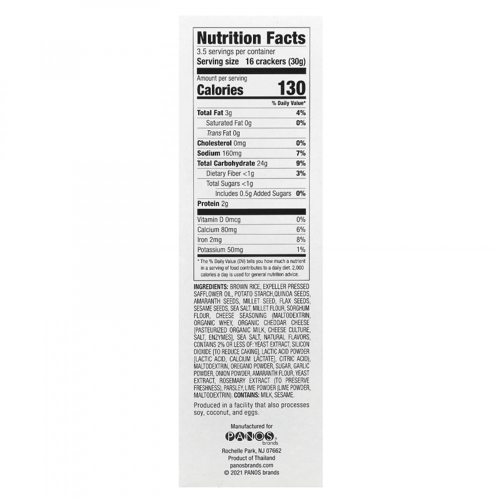 Коричневый рис, сафлоровое масло, отжатое шнековым прессом, картофельный крахмал, семена киноа, семена амаранта, семена проса, семена льна, семена кунжута, морская соль, пшенная мука, мука из сорго, сырная приправа (мальтодекстрин, органическая сыворотка, органический сыр чеддер [пастеризованное органическое молоко, сырная культура, соль, ферменты], морская соль, натуральные ароматизаторы, содержит не более 2% дрожжевого экстракта, диоксид кремния [для уменьшения слеживания], порошок молочной кислоты [молочная кислота, лактат кальция], лимонная кислота), мальтодекстрин, орегано, сахара, чесночный порошок, луковый порошок, амарантовая мука, экстракт дрожжей, экстракт розмарина (для сохранения свежести), петрушка, лаймовый порошок, мальтодекстрин).