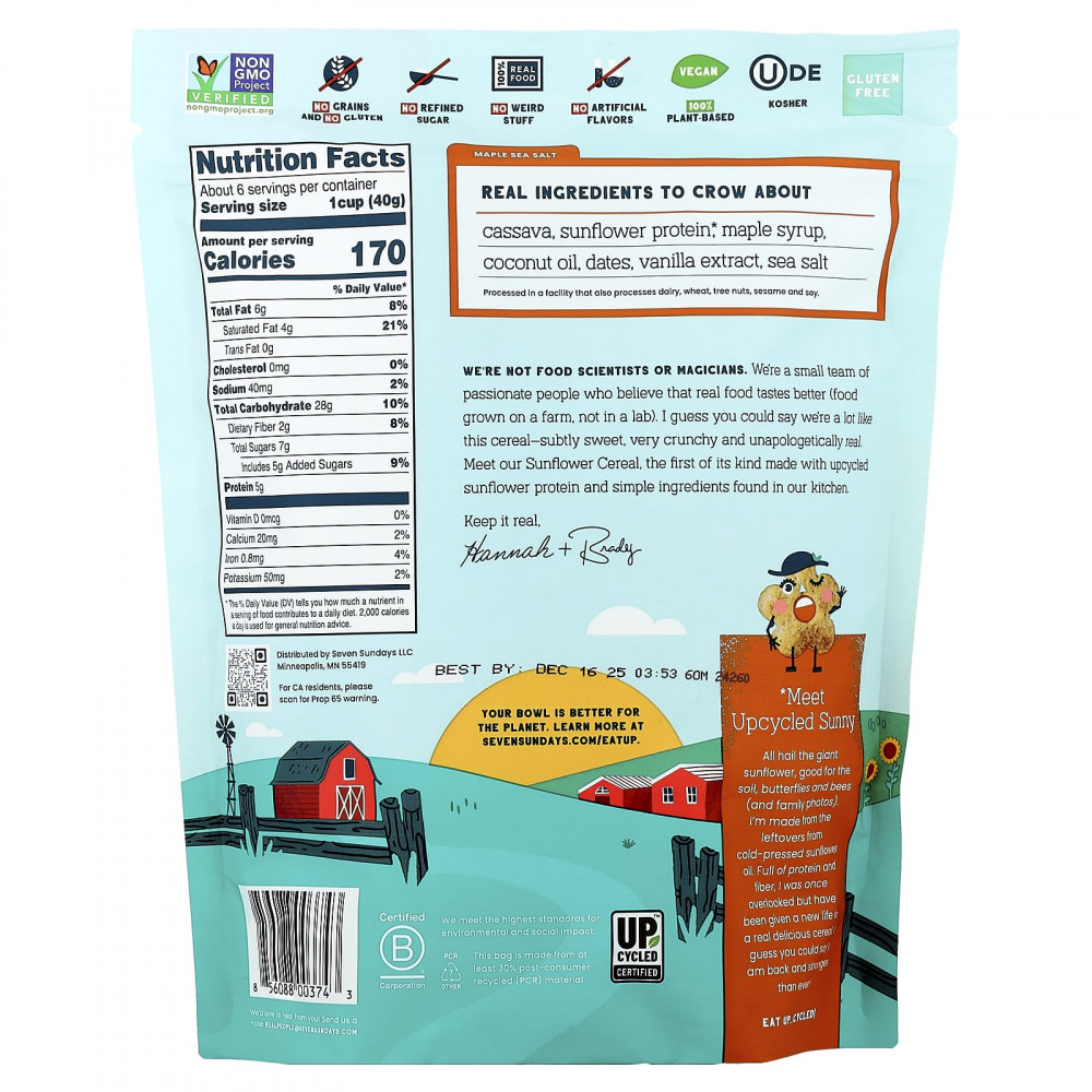 Мы не специалисты в области кулинарии и не фокусники. Мы - небольшая команда увлеченных людей, которые считают, что настоящая еда вкуснее (продукты, выращенные на ферме, а не в лаборатории). Я думаю, можно сказать, что мы очень похожи на эти хлопья - слегка сладкие, очень хрустящие и искренне настоящие. Познакомьтесь с нашими подсолнечными хлопьями, первыми в своем роде, изготовленными из переработанного подсолнечного протеина и простых ингредиентов, имеющихся на нашей кухне.