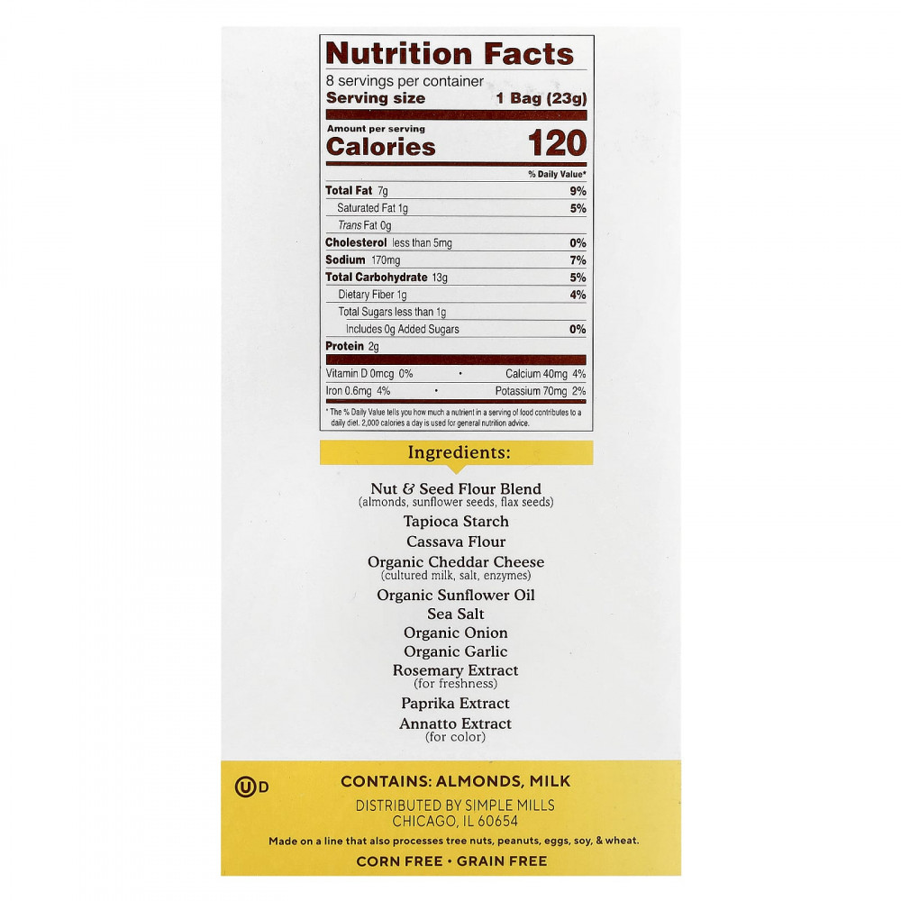 Nut & amp; смесь муки из семян (миндаль, семена подсолнечника, семена льна), тапиоковый крахмал, мука из кассавы, органический сыр чеддер (кисломолочный, соль, ферменты), органическое подсолнечное масло, морская соль, органический лук, органический чеснок, экстракт розмарина (для свежести), экстракт паприки, экстракт аннато (для цвета).
