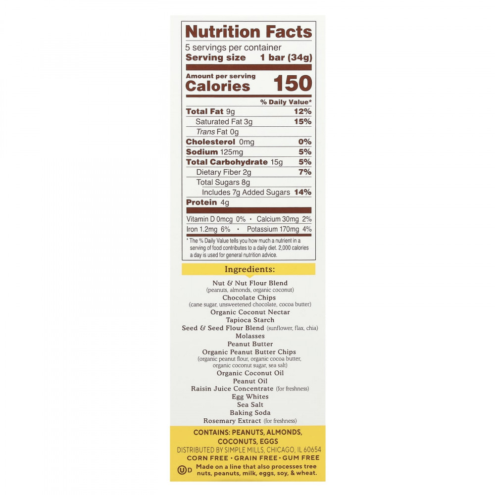 Nut & amp; смесь ореховой муки (арахис, миндаль, из органического кокоса), шоколадная крошка (тростниковый сахар, горький шоколад, какао-масло), органический кокосовый нектар, тапиоковый крахмал, смесь муки из семян (подсолнечника, льна, чиа), патока, Арахисовая паста, чипсы из органического арахиса (органическая арахисовая мука, органическое какао-масло, органический кокосовый сахар, морская соль), органическое кокосовое масло, арахисовое масло, концентрат сока из изюма (для свежести), яичный белок, морская соль, пищевая сода, экстракт розмарина (для свежести).