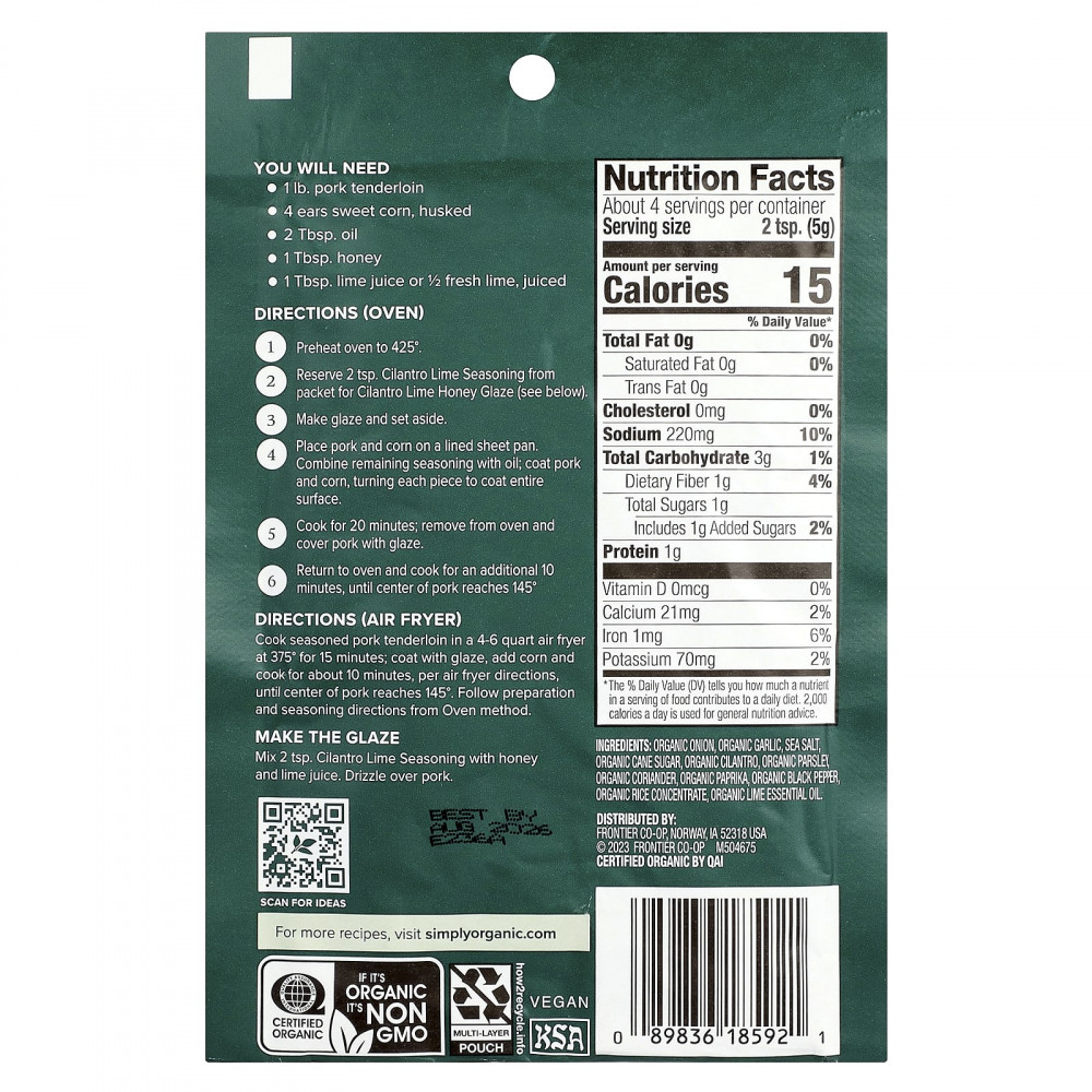 Этот пакетик с приправой для сковороды с кориандром и лаймом позволяет приготовить два продукта из одного пакетика: искусно приправленную свиную вырезку и сладкую кукурузу, а также сладкую пикантную глазурь к мясу. Свежие нотки кинзы смешиваются с цитрусовой цедрой лайма, чтобы создать эту живую смесь. Идеальное сочетание вкусов, которое сбалансирует вкусы черного перца и кориандра, дает ароматную приправу, идеально подходящую для свинины и кукурузы. Добавьте мед и сок лайма в часть приправы, чтобы создать медовую глазурь из кориандра и лайма, которой можно полить свинину - идеальное ароматное послевкусие.