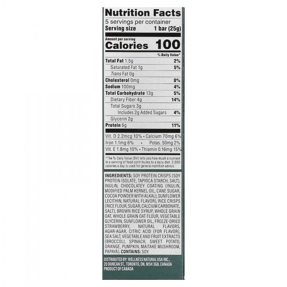 Чипсы из соевого протеина (изолят соевого протеина, крахмал тапиоки, соль), инулина, шоколадная глазурь (инулин, модифицированное пальмоядровое масло, тростниковый сахар, какао-порошок с щелочью, Лецитин подсолнечника, натуральный ароматизатор), рисовые чипсы (рисовая мука, сахар, карбонат кальция, соль), сироп из бурого риса, цельнозерновой овес, цельнозерновая овсяная мука, растительный глицерин, подсолнечное масло, сублимированная клубника, натуральные ароматизаторы, агар-агар, лимонная кислота (для аромата), морская соль, экстракты овощей и фруктов (брокколи, шпинат, батат, апельсин, тыква, гриб-баран, папайя).