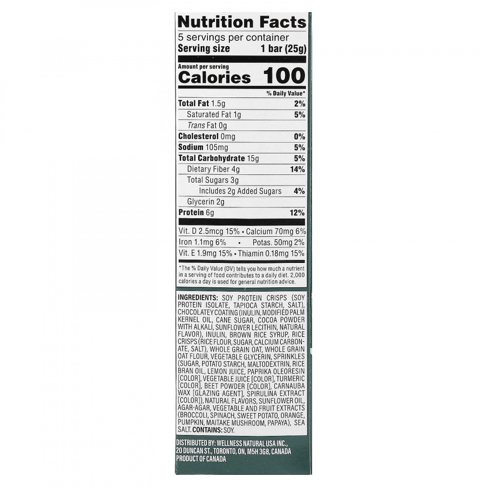 Чипсы из соевого протеина (изолят соевого протеина, крахмал тапиоки, соль), шоколадная глазурь (инулин, модифицированное пальмоядровое масло, тростниковый сахар, какао-порошок с щелочью, Лецитин подсолнечника, натуральный ароматизатор), инулина, сироп из бурого риса, рисовые чипсы (рисовая мука, сахар, карбонат кальция, соль), цельнозерновой овес, цельнозерновая овсяная мука, растительный глицерин, посыпка (сахар, картофельный крахмал, мальтодекстрин, масло из рисовых отрубей, лимонный сок, олеорезин паприки (краситель), овощной сок (краситель), куркума (краситель), свекольный порошок (краситель), карнаубский воск - глазурь, экстракт спирулины (краситель), натуральные ароматизаторы, подсолнечное масло, агар-агар, экстракты овощей и фруктов (брокколи, шпинат, батат, апельсин, тыква, гриб-баран, папайя), морская соль.